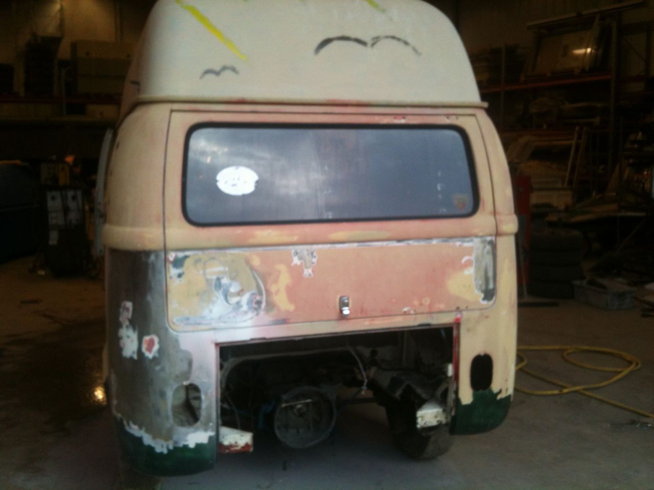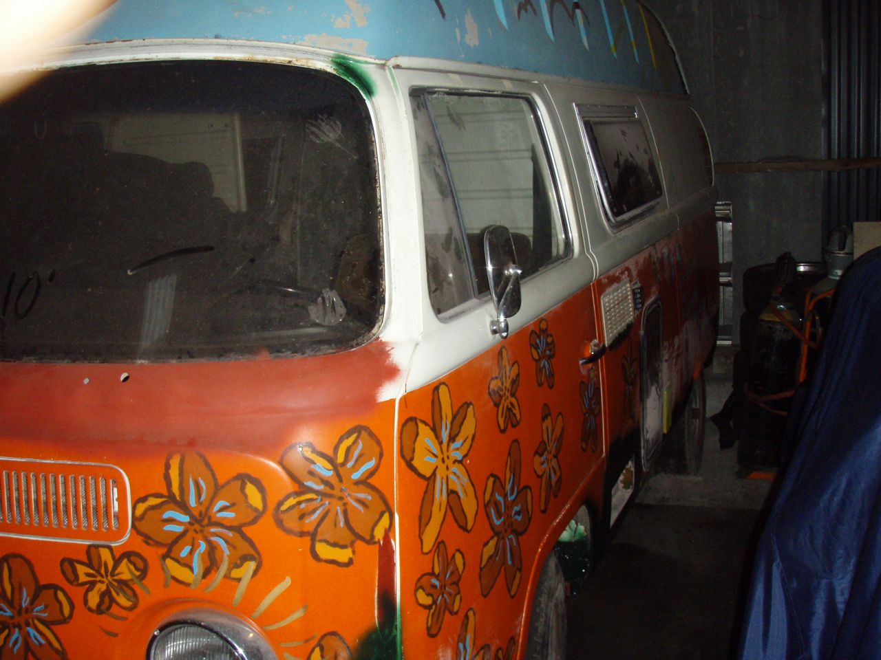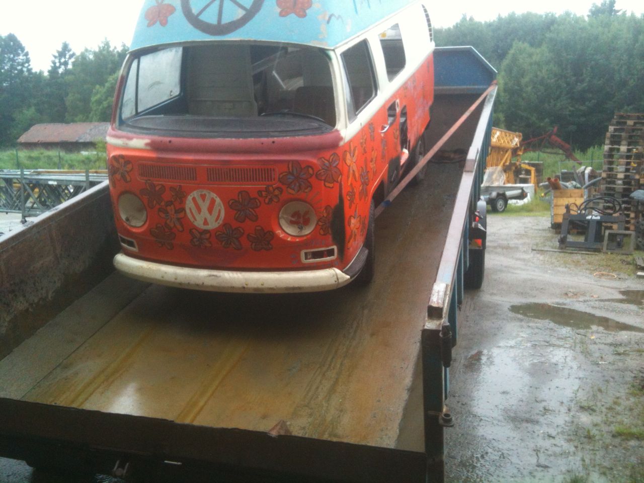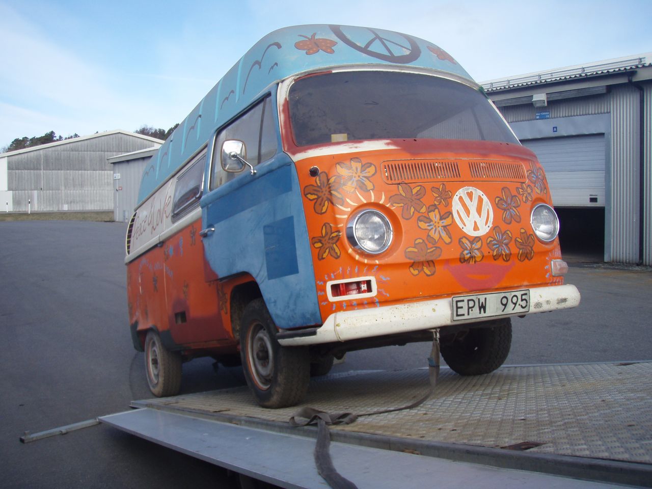 Hade vetat om en högtaksbuss i Säve flygfälts gamla hangarer. Den var hippiemålad och till stor del rostlagad. Hade skivbromsar och var redan typad med bostadsinredning.