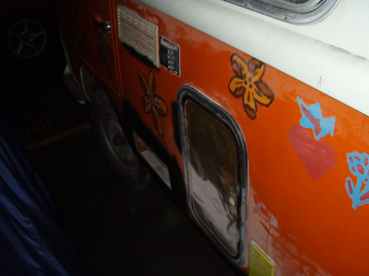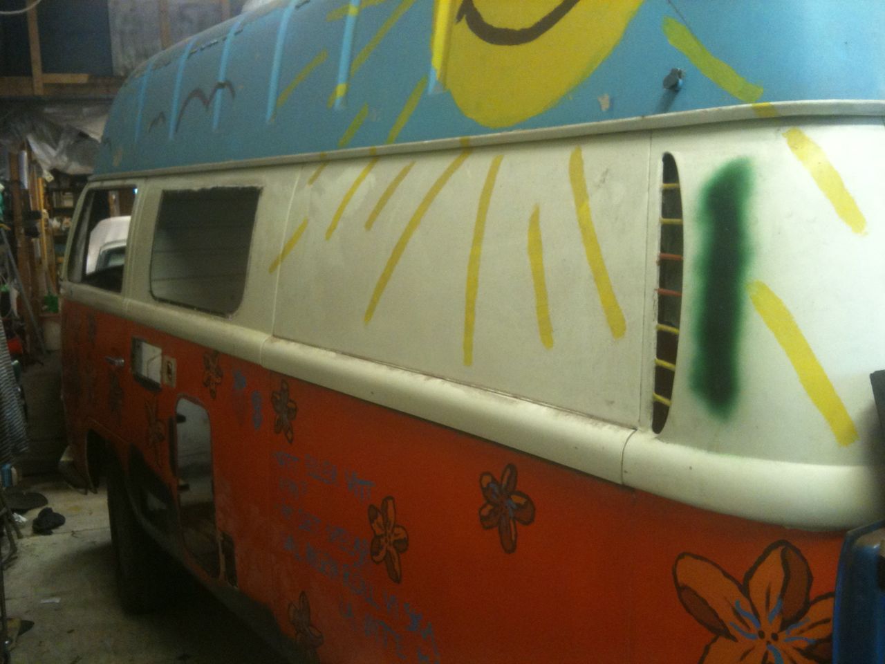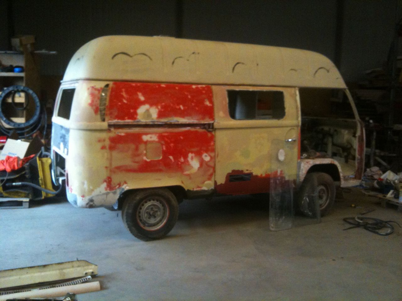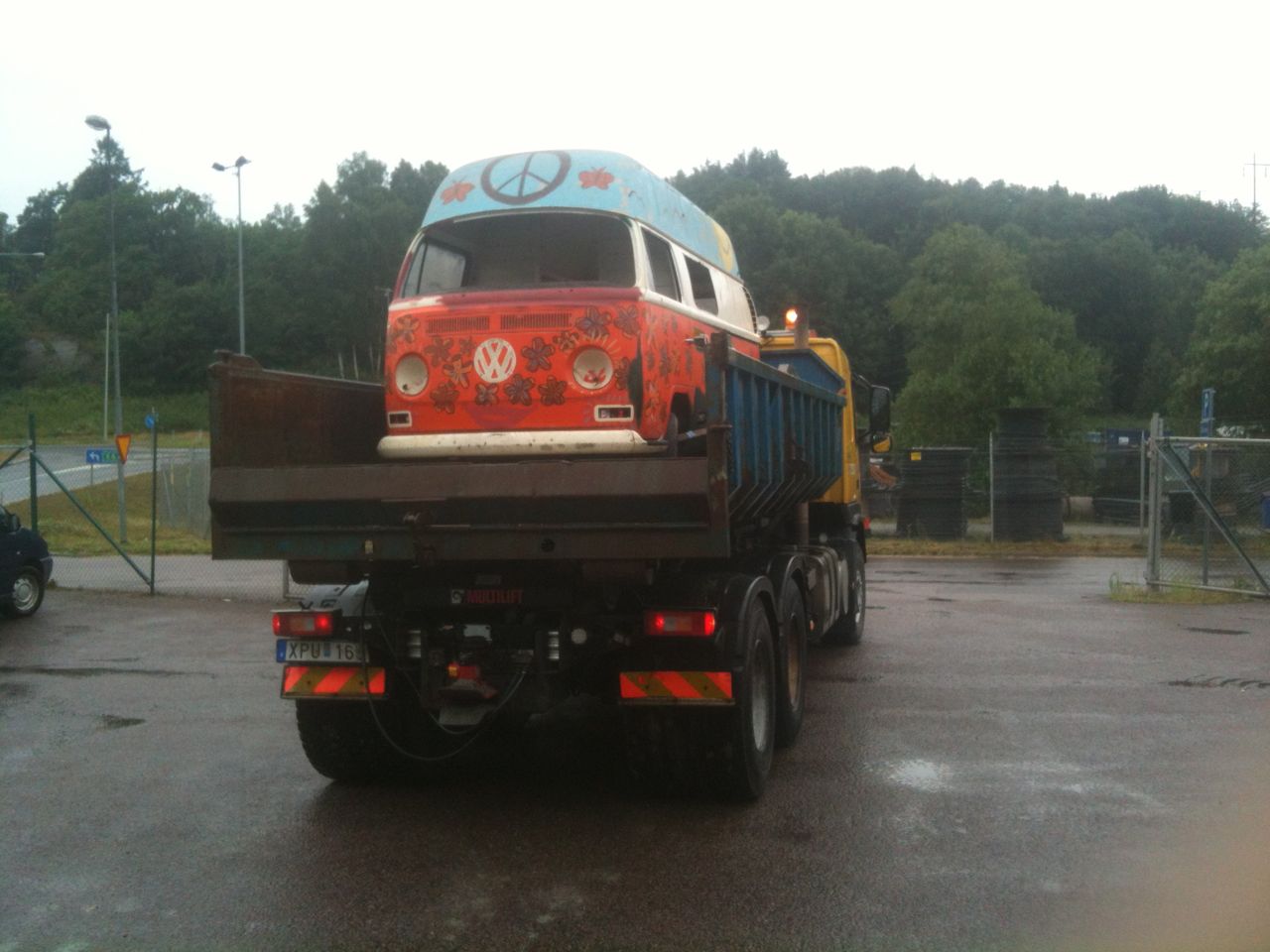 Hade vetat om en högtaksbuss i Säve flygfälts gamla hangarer. Den var hippiemålad och till stor del rostlagad. Hade skivbromsar och var redan typad med bostadsinredning.