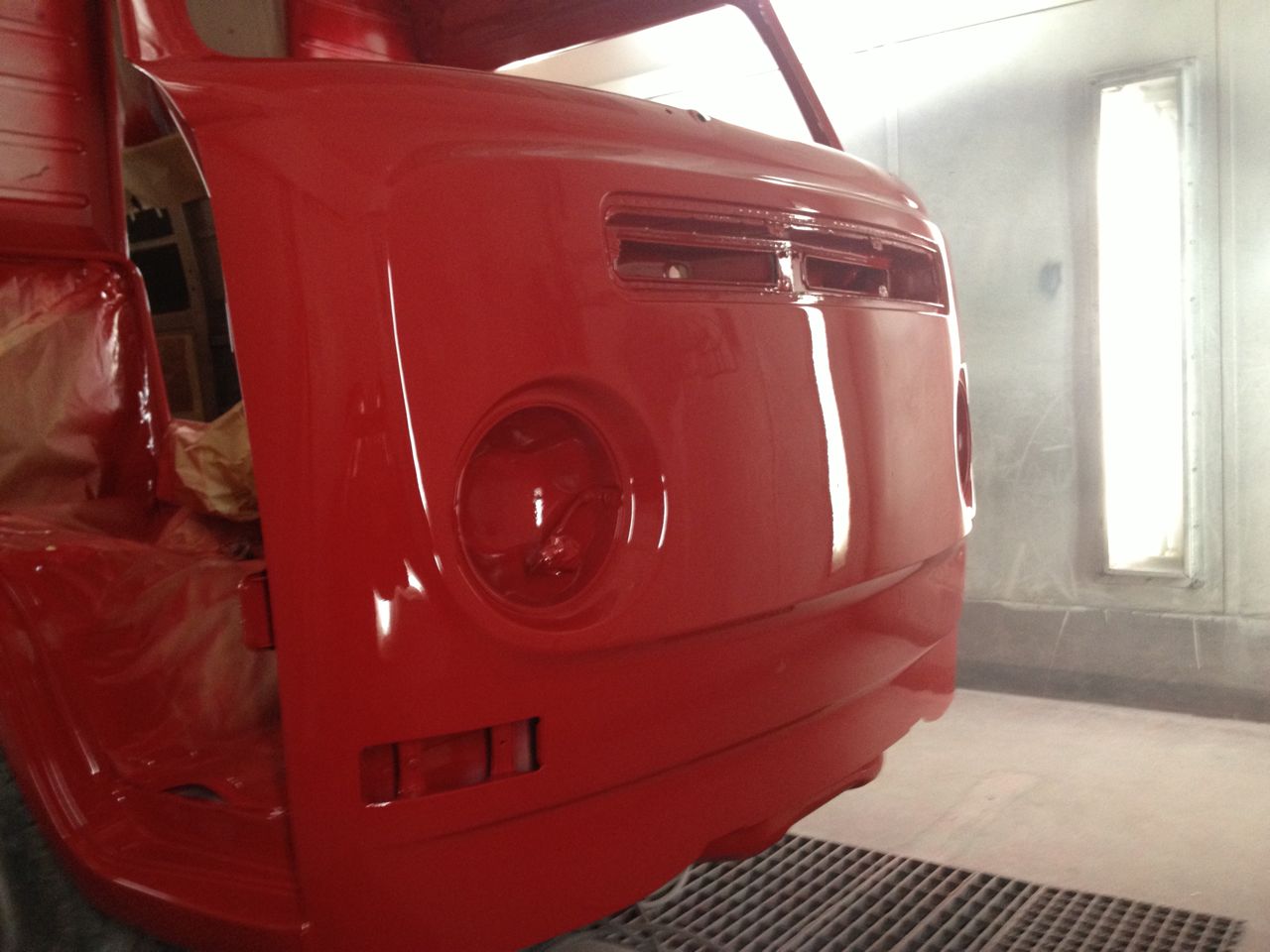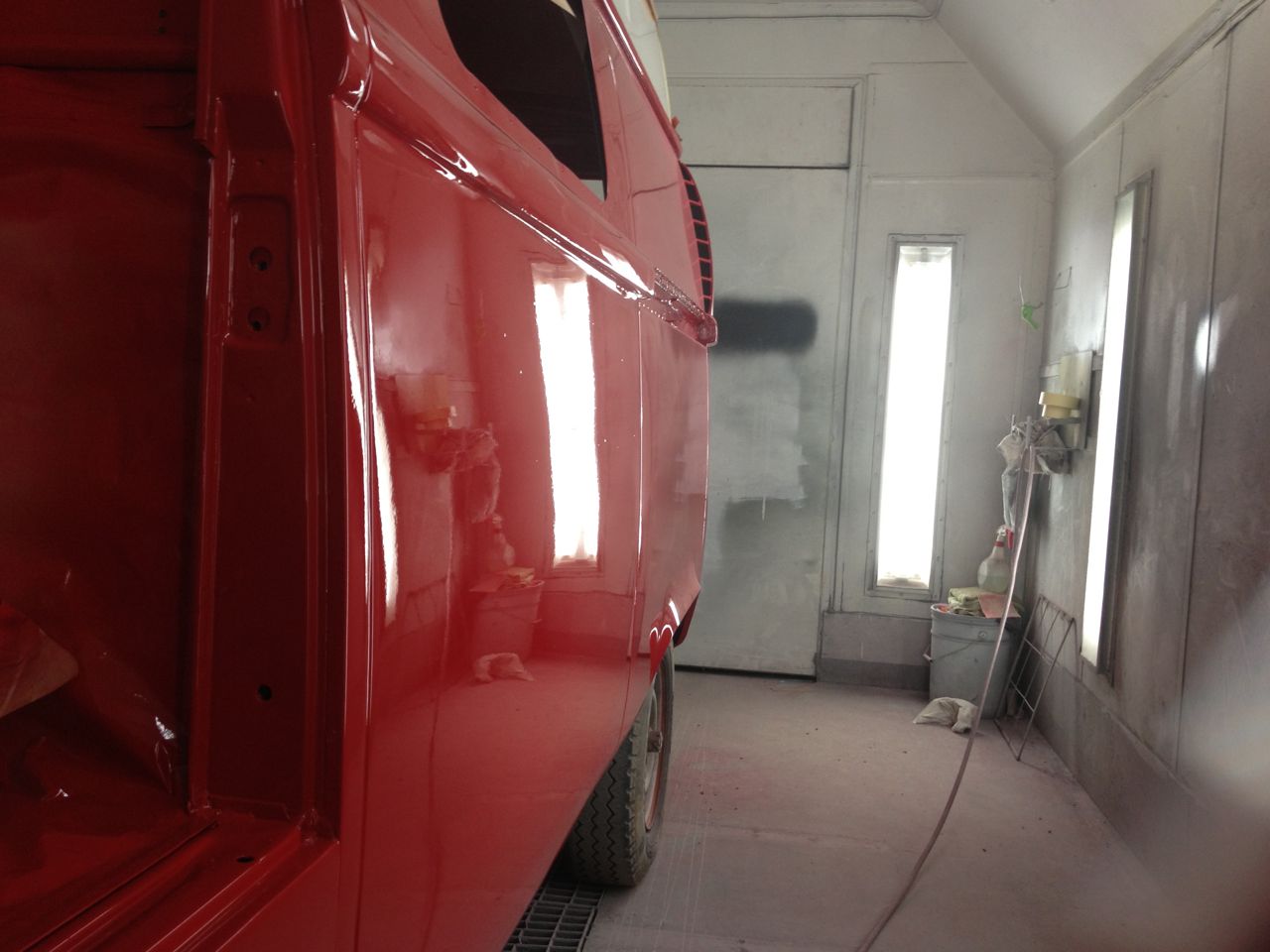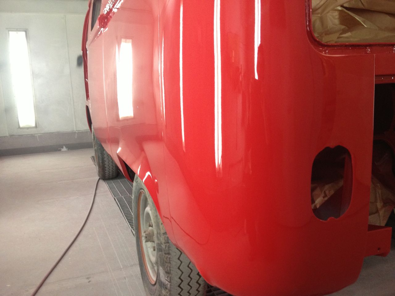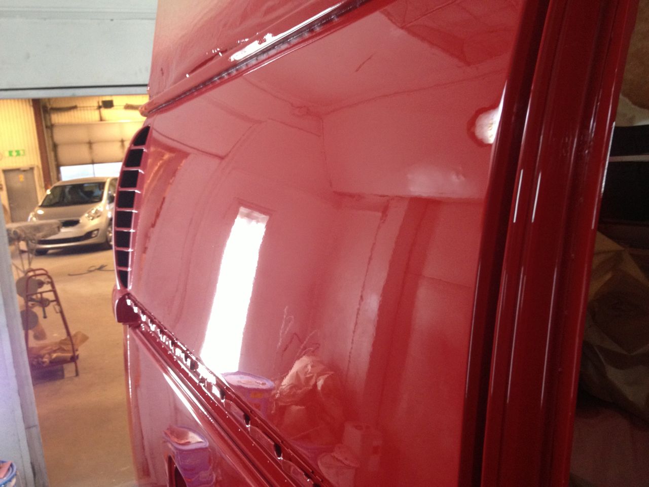 Hursomhelst så har lackerarn jobbat till och från med bussen sen i oktober.Nu är den färdig så när som på polering. Taket är L581 Cloudwhite och plåten är L30H Montana red med två lager klarlack. Kulören fanns på 68-70 bussarna. Passar nog bra på en 71a med.