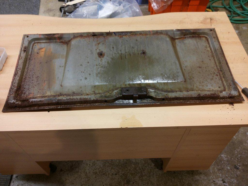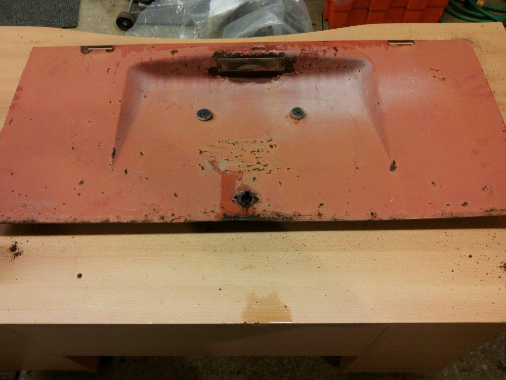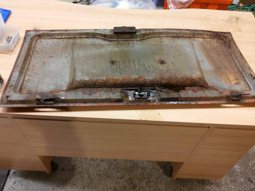 1 st Motorlucka (ej rätt till 55-58 så nyare än det) kapade gångjärnsfästen, låsmekanisme fastrostad