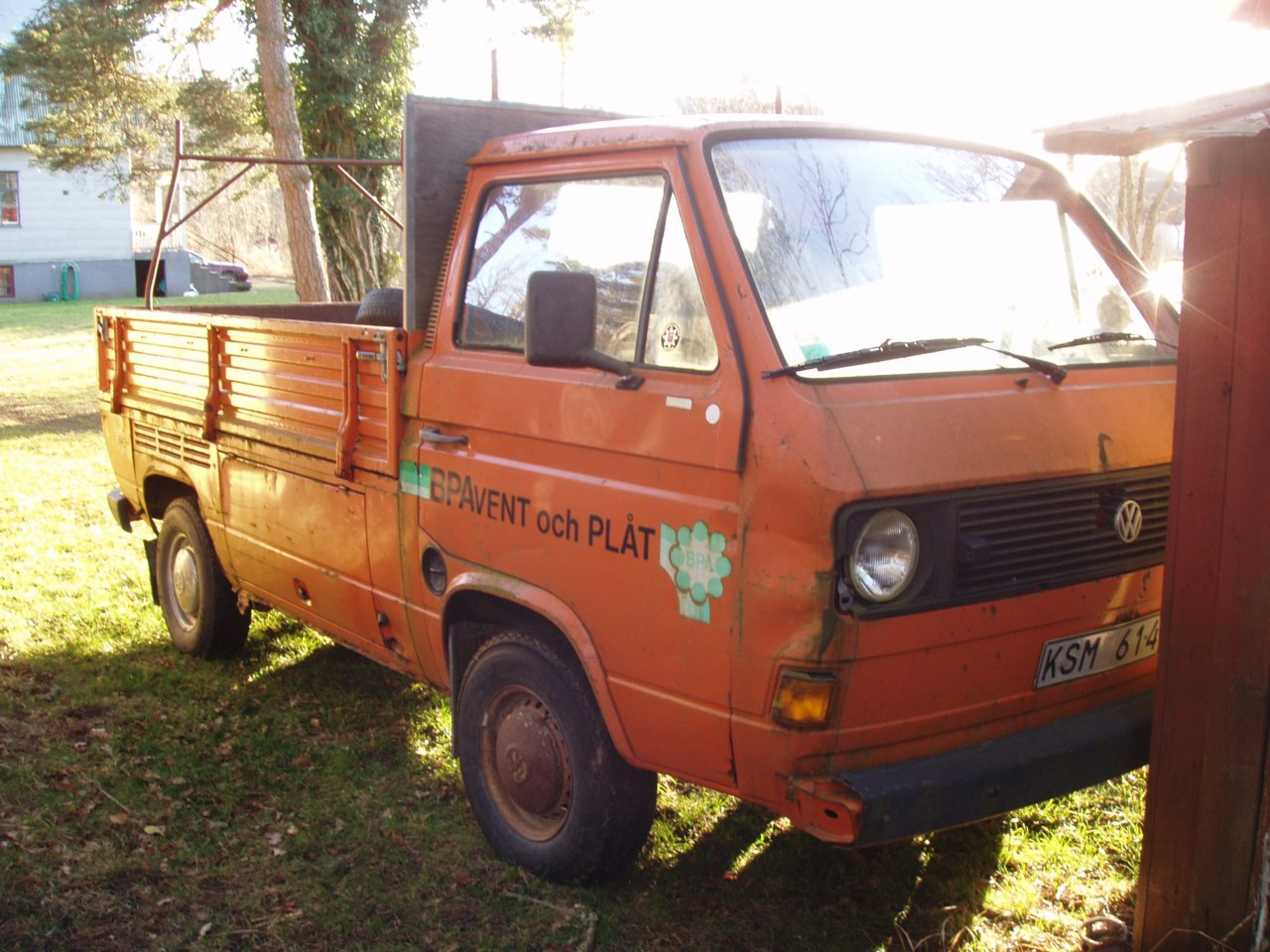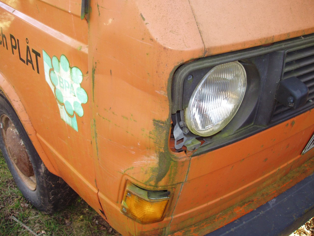 Undertill så verkar den faktiskt oförskämt frisk om man jämför med den hårt patinerade utsidan… För att beskriva utsidan; ytrost och bucklor finns både här och där, de stora rosthålen finns i nederkant av motorlucka, gångjärnsinfästning vä lastlucka (luckan under flaket), och på båda sidor precis framför lastluckan.