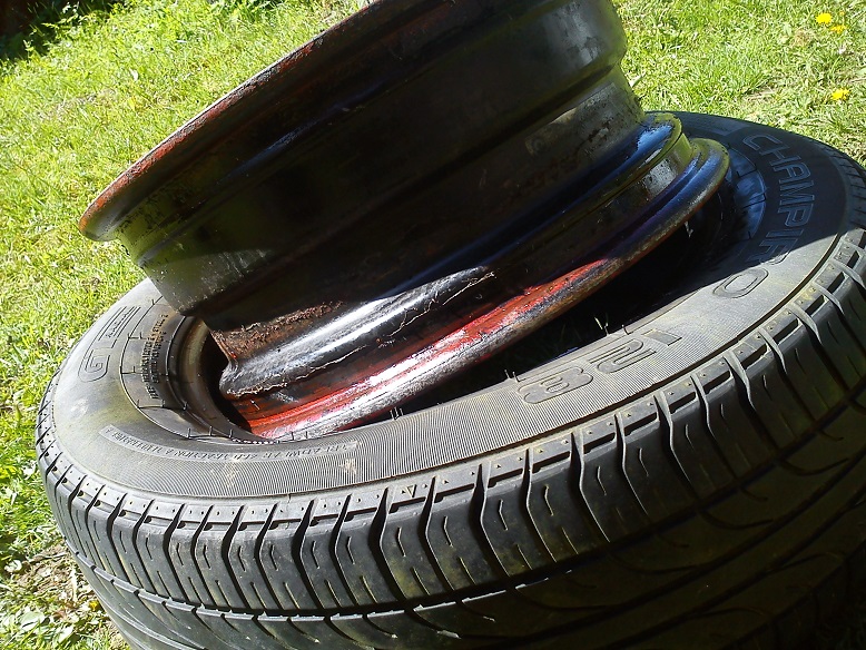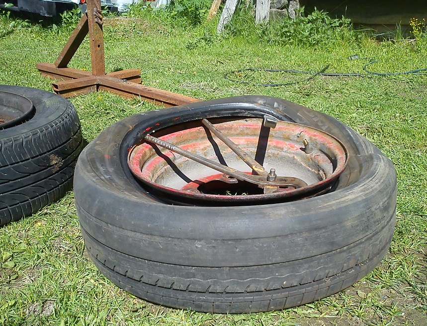 Jag har ett verktyg sen förut då min typ1a slet ut ett sett däck i månaden, men nu har den förlängda svärd så toe in blir mer rätt, och då går det lätt men man får vara försiktigt om man har lösa däcksidor. Men en lång stång och planka under en hög bil eller en knut funkar bra också. Man ska bara pressa ner däcket över kanten så det släpper sen kan man börja kränga.