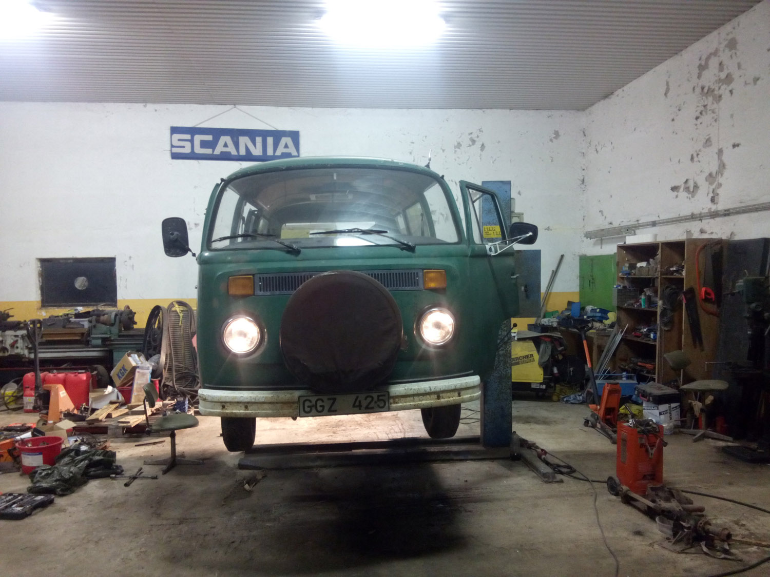 Nu sitter åter 1700 motorn i med begagnade toppar från Levideskroten och för tillfället pågår lite plåtjobb i balkar framtill. Hela bromssystemet bytt med nya ledningar, ok och hjulcylindrar. Bussen rullar åter för egen maskin på Gotland men besiktning blir först i vår när all rost är åtgärdad. Skall också fixa lite oljeläckage från stötstångsrören med nya gröna o-ringar som dök upp igår.