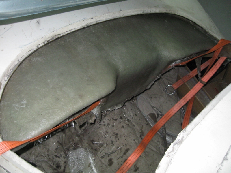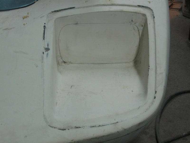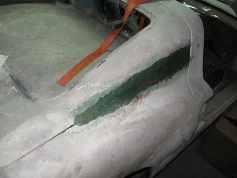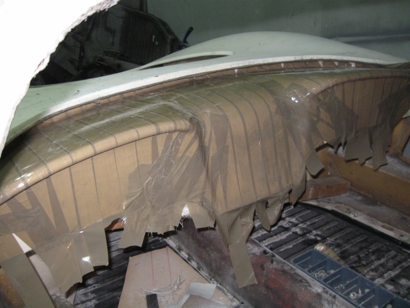 Så har det blivit lite plastat, karossen behövde efter flera år utomhus en ny skiljevägg mellan motorn och kupén. Skiljeväggen består av någon outgrundlig anledning av en plywoodskiva, det fick bli en ny skiva av samma material men som laminerades med ett lager plast på motorsidan för att bättre tåla vatten när man i framtiden vill göra en motortvätt. Ytan mot motorutrymmet kommer även att målas med body när det blir dags för lack. I skiljeväggens nederkant har jag även plastat en kant över plattan för att det ska täta bättre. Rrenskörning av glasfibern kvarstår dock och kommer inte att göras förrens karossen åter lyfts av plattan.