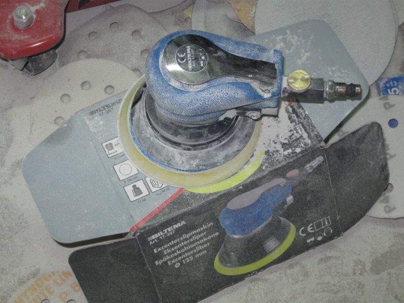 Vid tidigare renoveringar har jag slippat mycket för hand men på grund av att axeln aldrig blir bra så köpte jag en billig liten slipmaskin och trots att den är köpt på Biltema så är jag mycket nöjd med den, saknar dock anslutning till dammsugare så det är tyvärr ett minus.