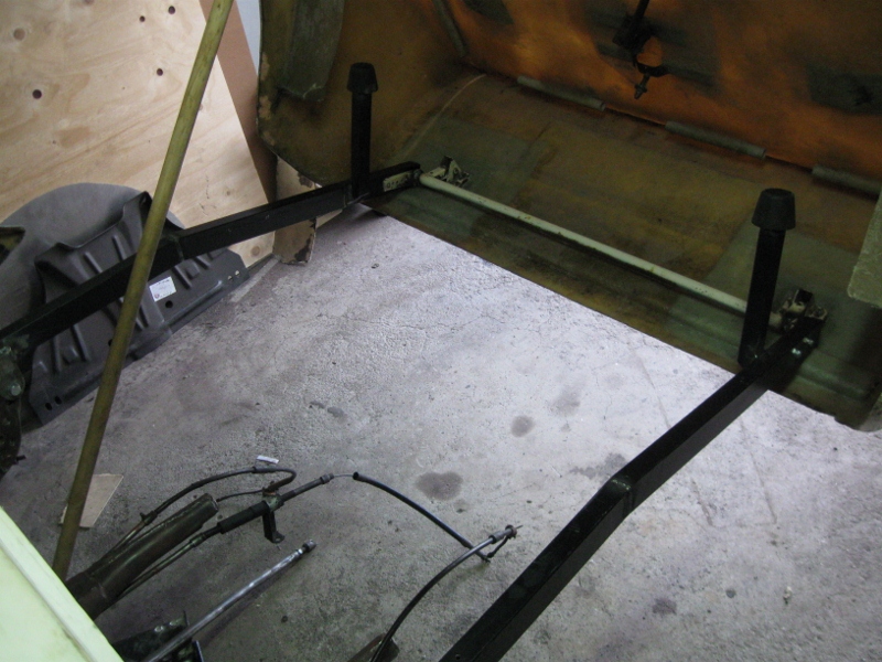 Karossen är åter monterad på plattan så att jag kunde färdigställa ramen som ska hålla bakdelen. Ramen byggdes i fyrkantsrör och gångjärnet kommer från en BMW huv som blev över efter en renovering som utfördes 1995. Återanvände även genomslags gummina från framvagnen till stöd så att bakdelen numer vilar på dessa.