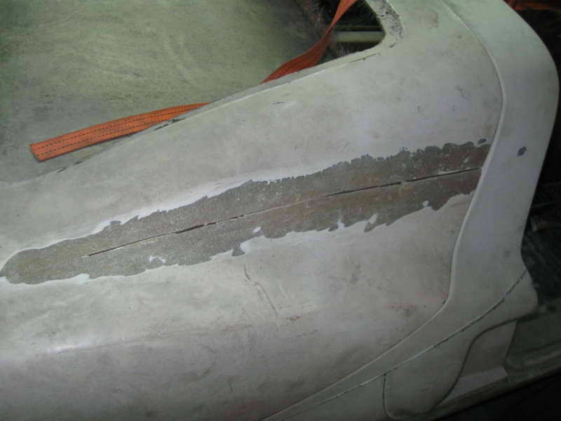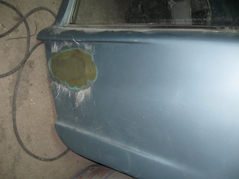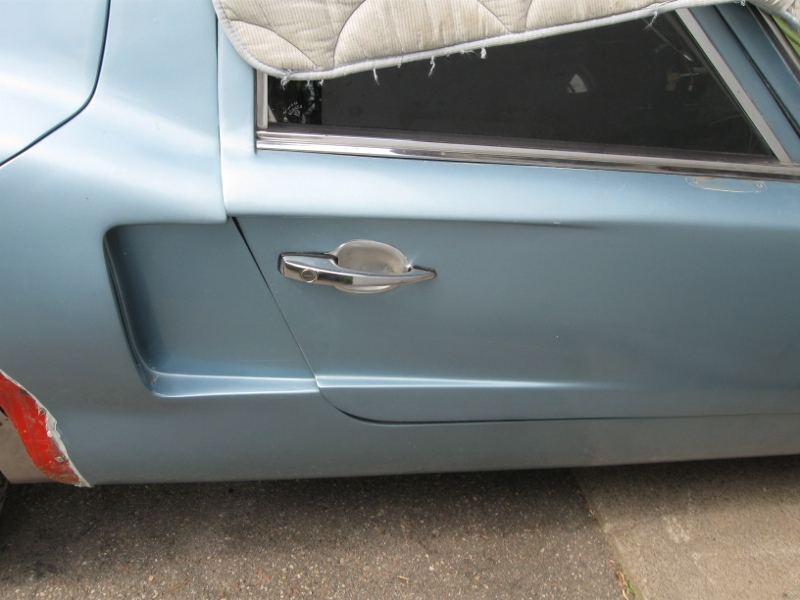 Vidare så har en del sprickor som uppkommit i karossen när den har flyttats runt åtgärdats, har även lagt igen hålen för dörrhandtagen. Dörrhandtagen var tagna från någon VW modell och enligt mig passar de mindre bra på den här karossen. Hittade ett dörrlås på skroten från en Simca, det låset består endast av en tryckknapp och är lite diskretare än VW handtaget. Det blir bara ett lås på förardörren, passagerardörren får man öppna inifrån. Dörrarna behåller jag från den gamla karossen på grund av att han som byggde om bilen hade lyckats få till vevbara rutor i dom, den enda modifiering som jag tycker var lyckad för övrigt...