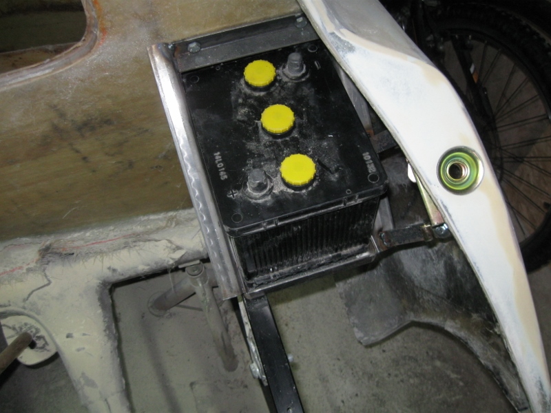 Och till sist så har jag hunnit med att bygga batteri hållare till 2 st 6v batterier och monterat dessa i bilen. Batterihållarna har även fått agera fästpunkt till bakdelens låsmekanik, en på vardera sida och dessa kommer från VW.