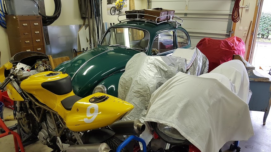 Det som får plats i mitt lilla garage med låg takhöjd, är en buggy, en moped, en klippo, några cyklar och massa "bra att ha" grejer som motorer och diverse verktyg...