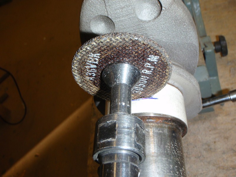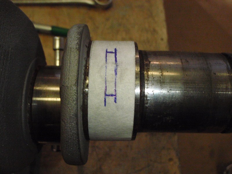 En sak som rekomenderas i "how to..." boken är att slipa ner spår på ramtapparna för att få upp mer olja till vevlagren. Detta är något som Landelius brukar göra också. Men första försöket blir inte bra, spåret blev onödigt brett o inte på exakt rätt ställe grrrrr ICQ/ac  Detta är ju ytan som bär upp oljefilmen som veven snurrar i så det vill man inte reducera mer än nödvändigt!! Jaha bara att kasta den veven o leta upp en annan ICQ/ac tur att man håller på med std prylar ICQ/ab  . Den jag valde kommer från en annan industrimotor som gått väldigt lite men som det stått vatten i Default/yikes så det är några rostblemmor men i övrigt ser den fin ut o efter slipning blir den nog bra. Nytt försök med spåren, med maskeringstape på tappen o noga inmätt var spåret ska va för att stämma överens med smörjhålet i lagret så gick det bättre ICQ/ab  Denna operation görs på dom 3 stora ramlagren.