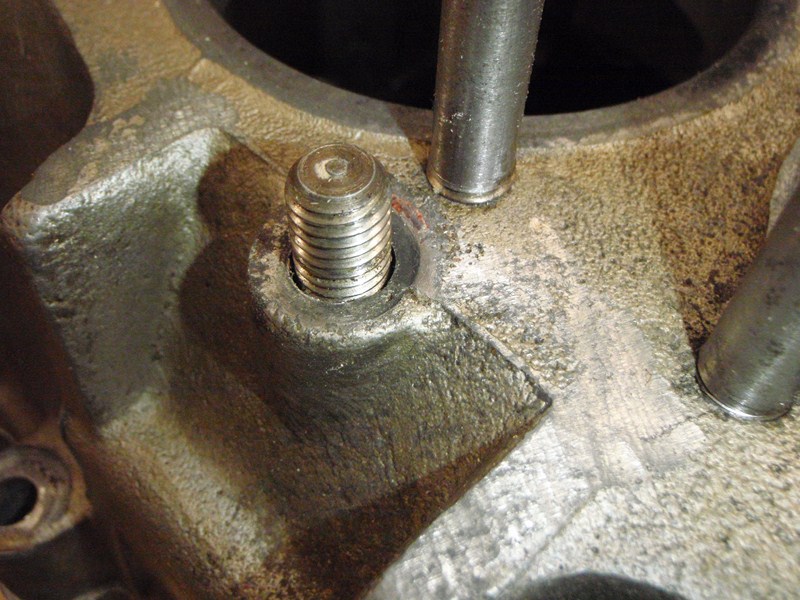 Lite annat jobb på motorn har hunnits med. Hjärtat dvs oljepumpen har gjort sitt o en ny 21 mm (19 mm original) ska dit. Det finns en för M6 pinnbult o en för M8 pinnbult, det är M6 i en 30 hk o för att montera en sådan krävs längre pinnbultar o eftersom originalen är rullgängade så måste gängan i blocket rensas upp.