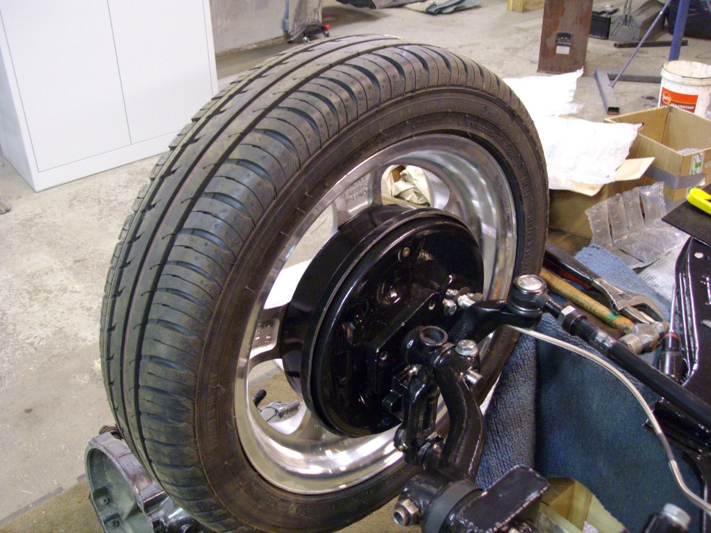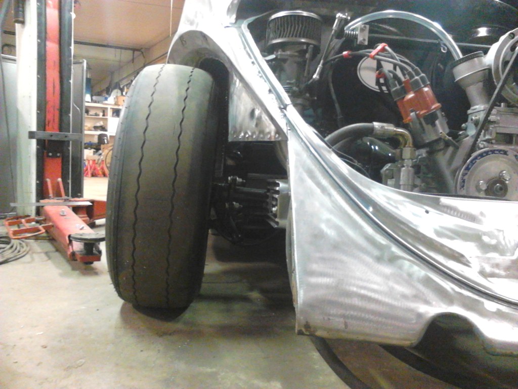 Så sakta sakta så kommer bilen ihop, har ställt på karossen igen för att kolla så det blir bra med däcken och frigång och så. Och frigången är lite kass behöver rulla skärmkanterna för att det ska gå att styra. Har lånat ett par Gammal skärmar som jag tänkte ev köpa men det blir nog inte så för jag vill inte borra för blinkers och rulla ihop så har fina skärmar