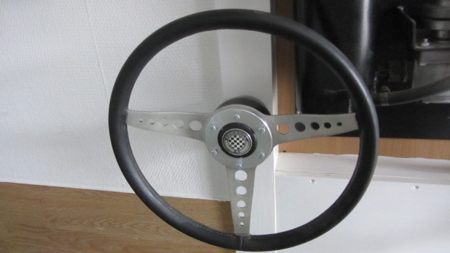 Sen skojjade jag till en MG ratt också, tyckte om utseendet på ratten så jag svarvade ur splinesen, slaktade en orginalratt (VW 60 tal) och svarvade ner navet och svetsade fast det i MG navet, sedan svarvades en "tuthållare" och en cool Formula tutknapp som köptes på Tradera fick kröna den till slut. Jag tycker den blev bra.