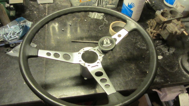 En golf ratt som införskaffades på Pålsboda marknaden/träffen i våras och som skall VW typ1 modifieras. Jag letade fram ett nav som har slipats ur för att ekrarna skall få plats och nu skall en "tuthållare" tillverkas i aluminium för att sedan passa in tutknappen. Inte riktigt klar ännu men snart så.  ICQ/ab