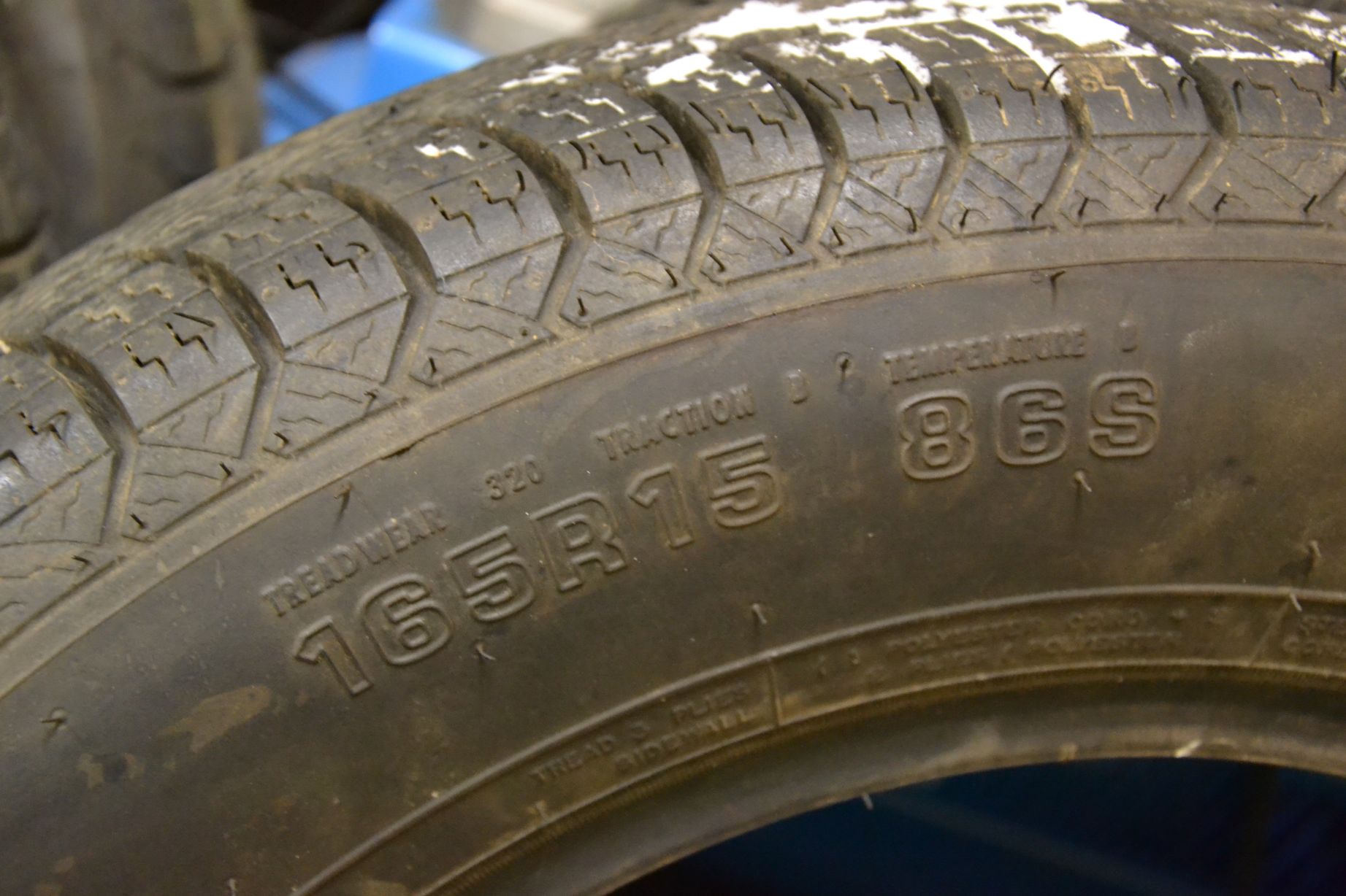 fräsha 165/15/86 däck som suttit på bubbla plåtisar, orginal dimension skulle ja tro.