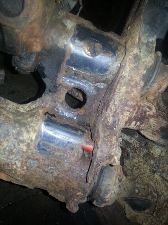Skit! Plockade bort framvagnsgrinden från plattan och kunde konstatera att plåtmasken ätit ur ett rejält stycke ,gick ut och bultade bort en framvagn från en annan variant som står på gården,såg fin ut.