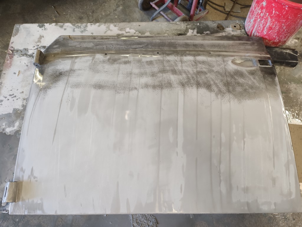 Jo jag ska matta ner den igen! Och måla den en tredje gång, då spacklet reste sig lite grann så man kan ana var den är. Och det går ju inte an. Men det funkar då jag har dörrarna och bakluckan kvar att måla, måste dock sprutspackla insidan på dörrarana först och slipa ;-)