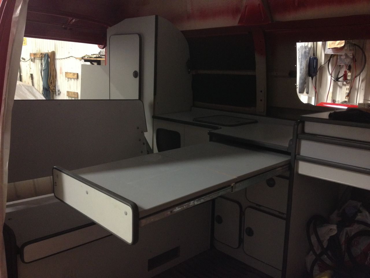 Bordsskivan består av två delar, och när den fälls in så lyfts den innersta skivan upp så att den andra kan glida in under. Fiffigt. Det är ingen Westfalia inredning detta utan någon annan tillverkare, troligtvis England.