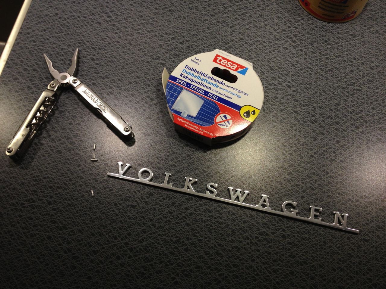 Lite pepp behövs ju emellanåt så emblemet till bakluckan fick komma på plats med. Har länge funderat på om jag ska använda clips som är original eller dubbelhäftande tejp. Det blev dubbelhäftande tejp.