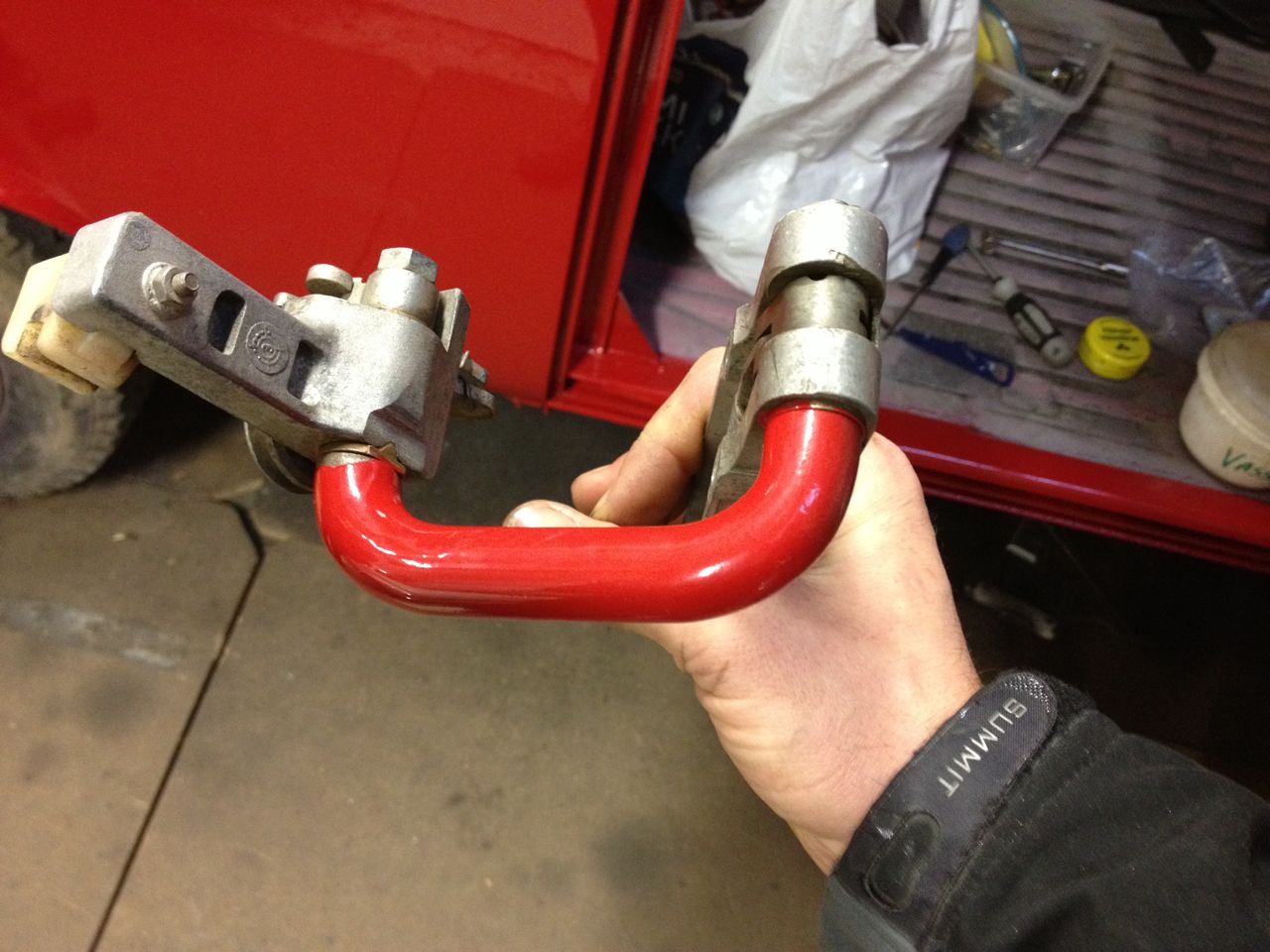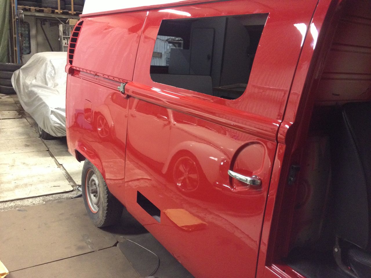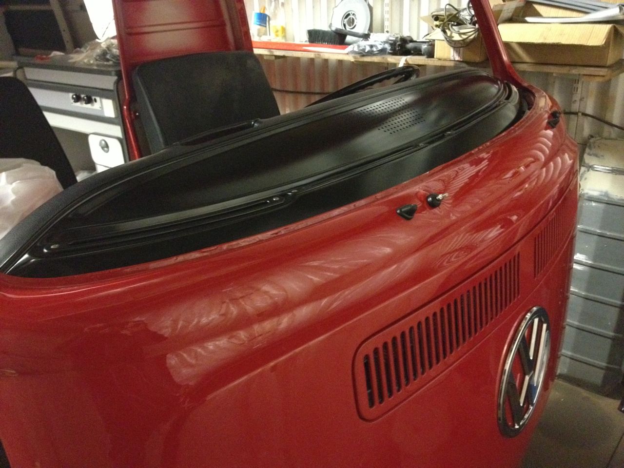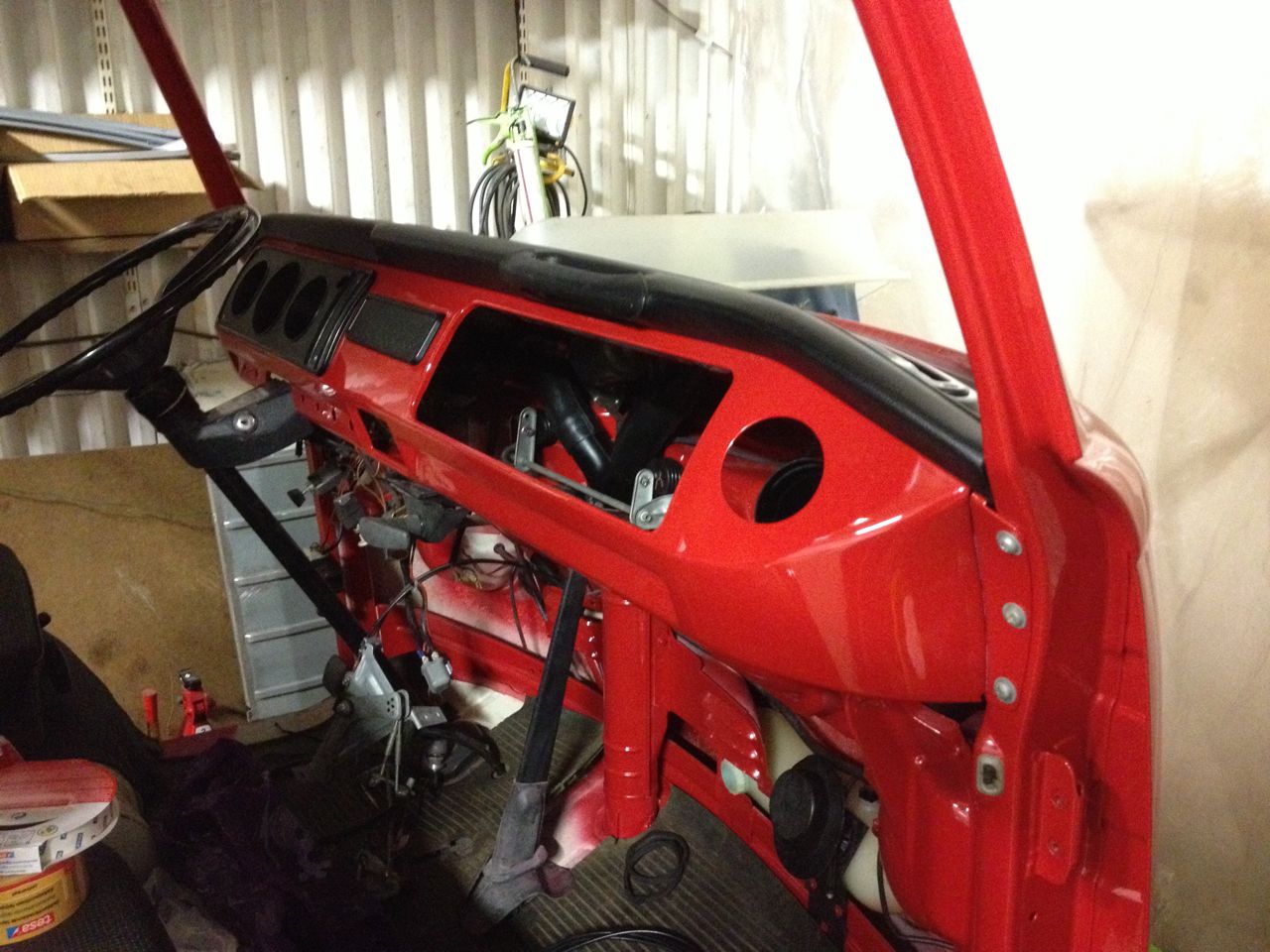 Och ett besök hos lackeraren resulterade i färdig baklucka, instrumentbräda (med svart ovandel) skenkåpa till förarsidan och gångjärn till motorluckan.