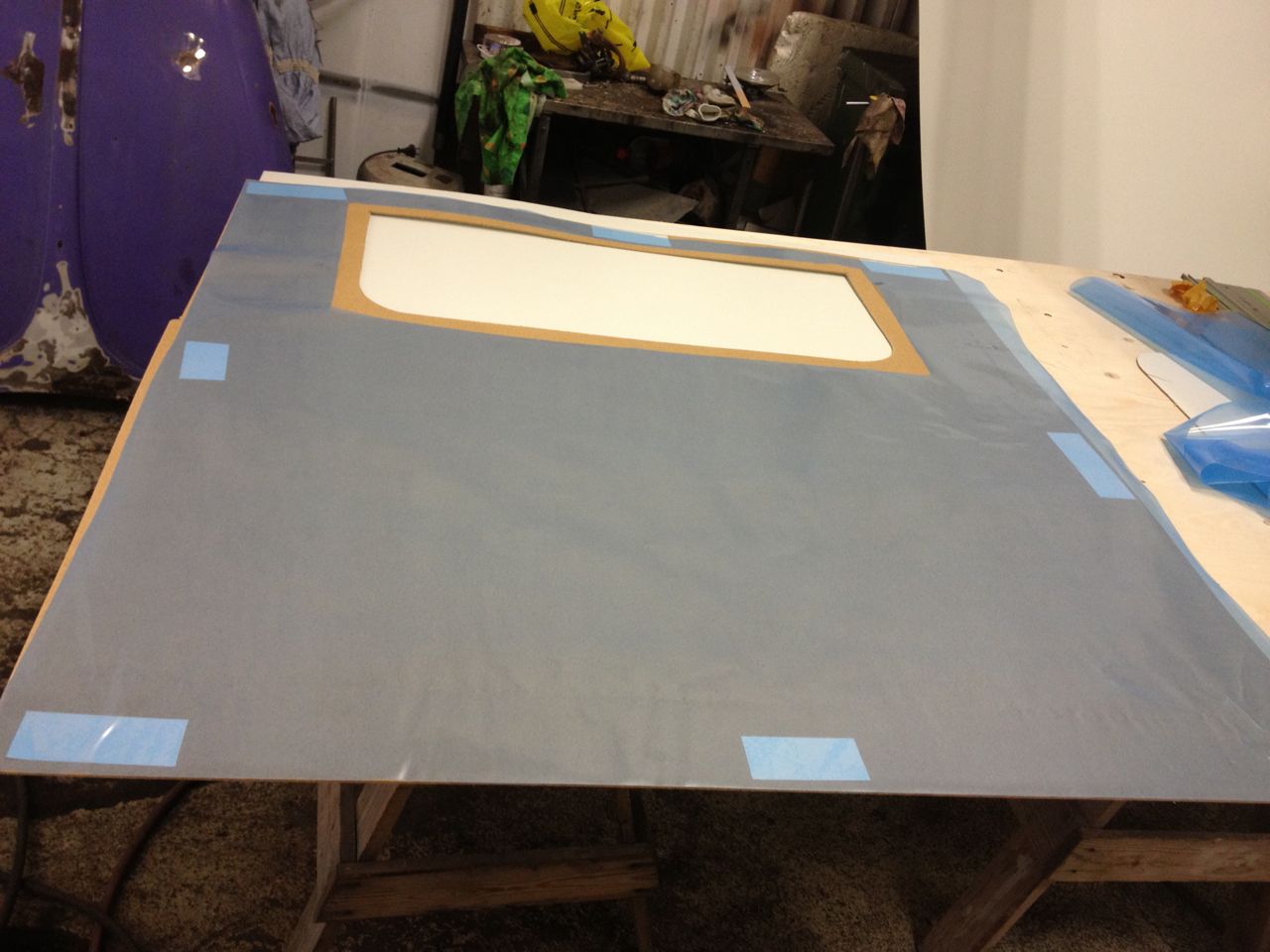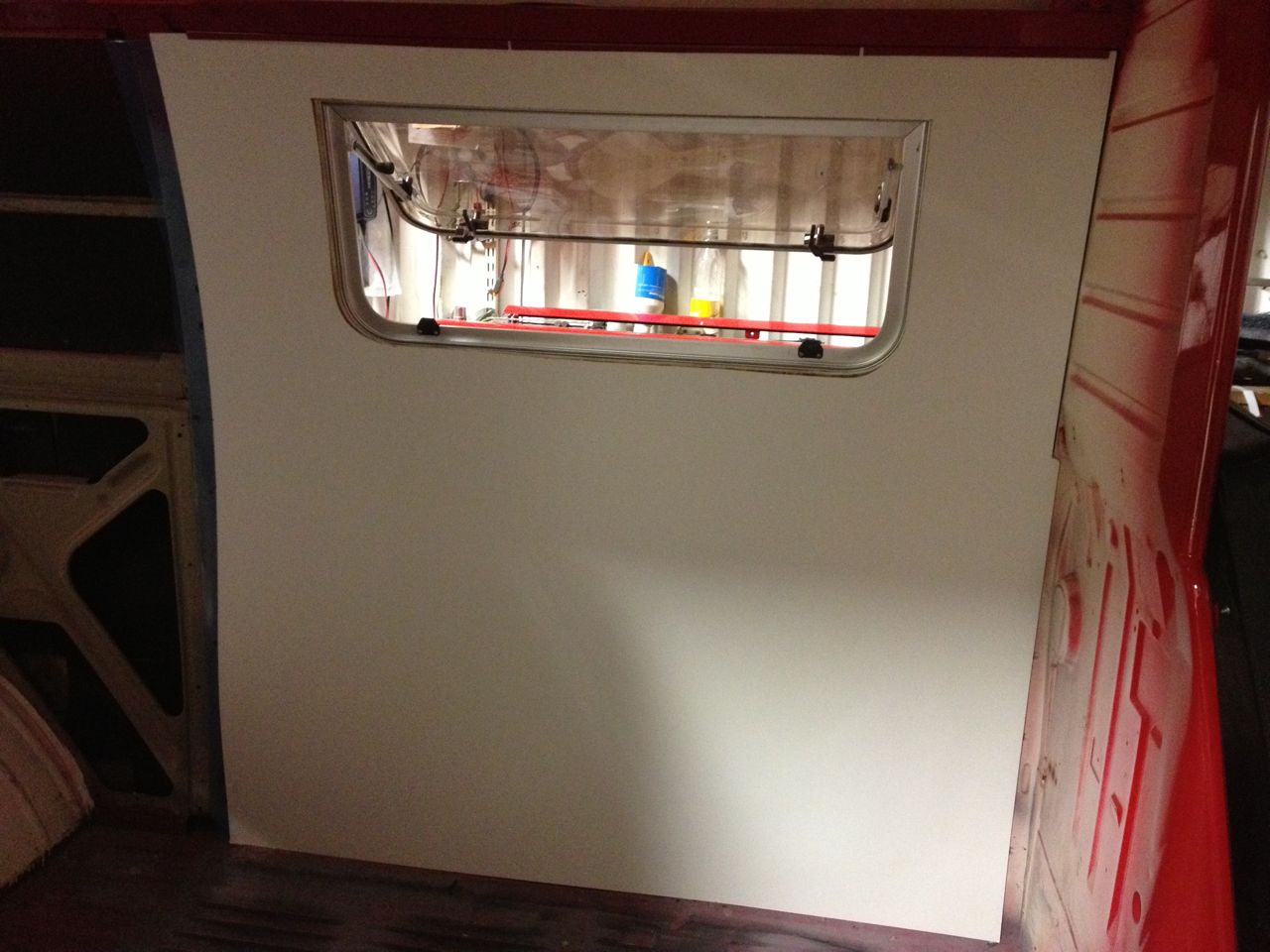 Iväg till garaget, markera var avgasrörsplåten för kylen ska ut.Isolerade väggen bakom kylen, satte in fönstret tillfälligt, kapade till en bit masonit. Ritade av från utsidan. sågade ut. Sen plastade jag bakom masoniten med dubbelhäftande tejp. Man gör ju så när man bygger hus för att motverka daggpunkt. Så det borde väl bli samma med sovande folk i en buss, att utan plast blir det kondens på plåten. Nu har ju jag plasttak och värme/fukt stiger, med det känns fel att inte göra så.