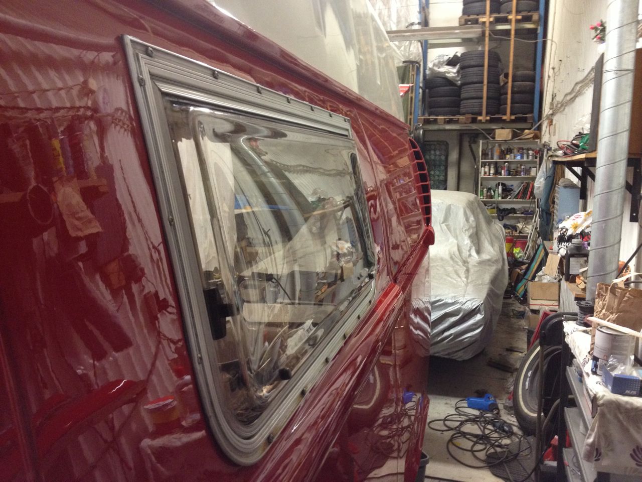 Stoppade i rutan igen med färskt gummi från justkampers, och satte sedan på spegelfilm på glaset. Har haft det på en gammal buss, och gillar stuket som blir med spegelfilm.