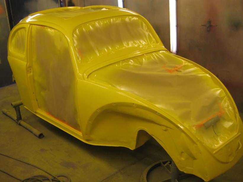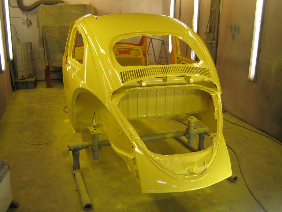 Spruta boddy i skärmhusen, som ska lackeras över med gul färg.