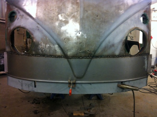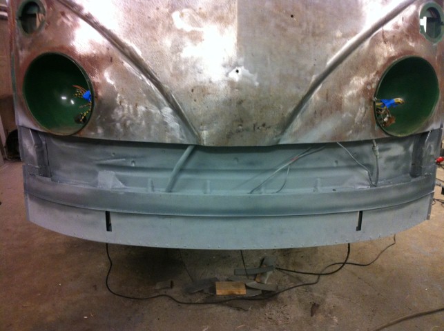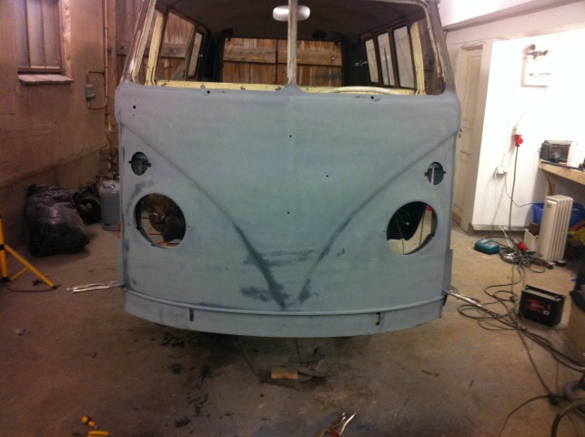 Efter slipning av fronten, kom jag fram till att det nog var lika bra att få bussen blästet. (slipning är intet roligt och blir inte lika bra)