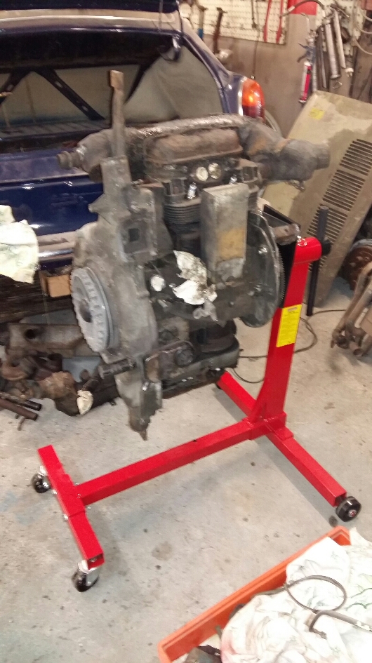 Äntligen fick man tummen ur å skaffa ett stativ att hänga motorer i, snidade ihop ett fäste för en boxer så nu blir det lite enklare att fortsätta med den kosmetika renoveringen.