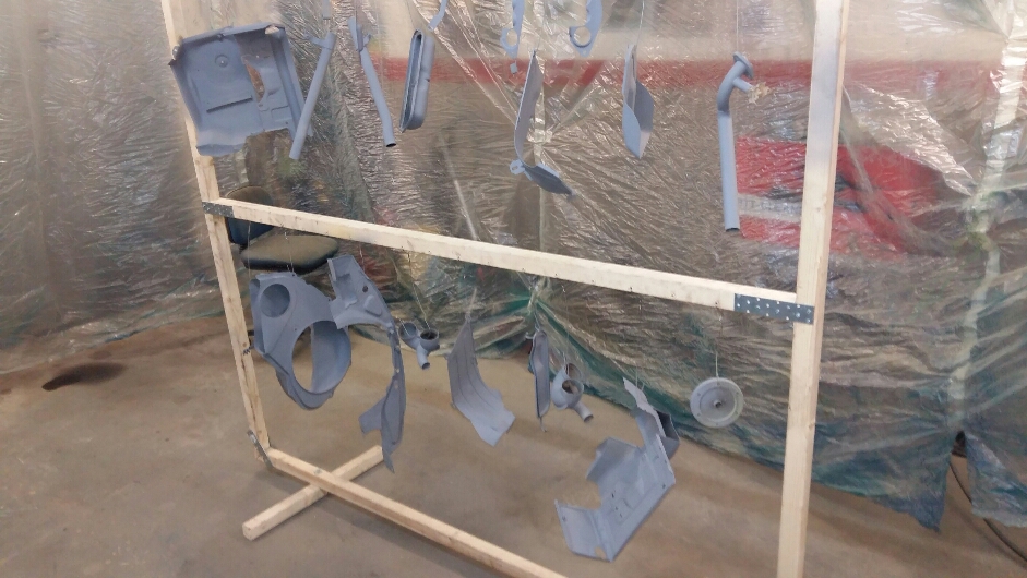 Målar motorkåpor, först epoxy primer, sen en vanlig primer som sealer