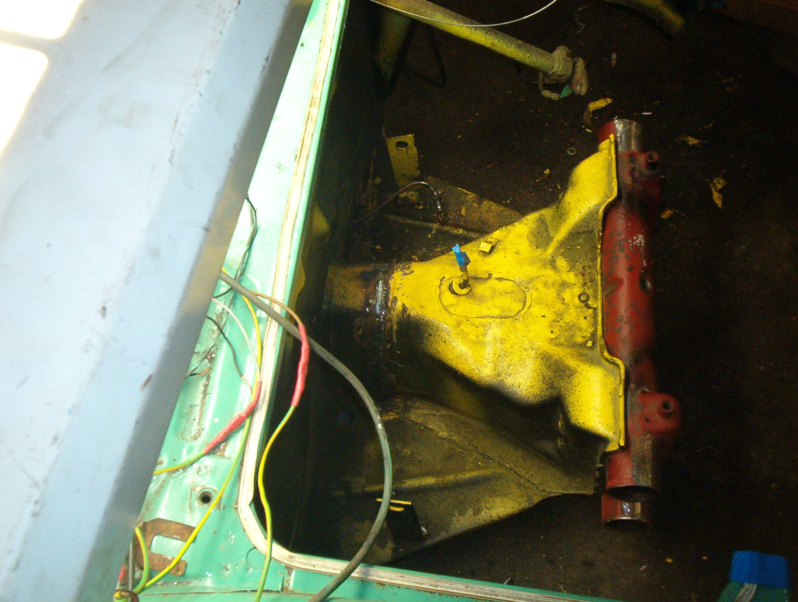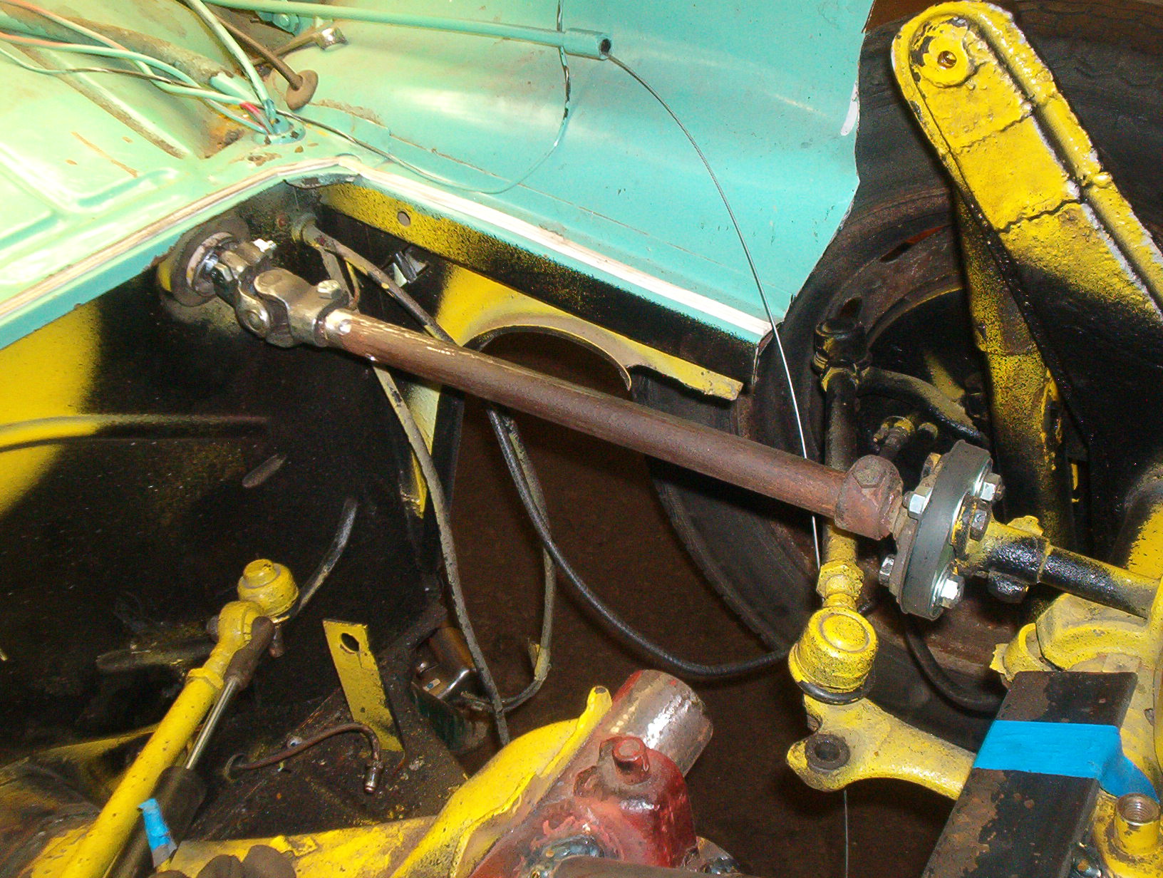 dag 3 att koppla ihop ratt axeln, det blev att göra en specialare,kapade ratt röret vid torpeden satt en orginal lagring i ändan på röret kapade ratt stången precis vid väggen tillverkade 2st insticks bitar för att fästa cheva knuten på,kapade till en förlängnings bit av en annan ratt axel vinklade ner snäckan lite grann o skruvade ihop packetet (vad enkelt det lät mot vilken tid det tog att göra Default/hmm ) ,sen vinklade jag upp tanken lite så allt går fritt så nu återstår bara lite svetsning o ihop montering av resten:D
