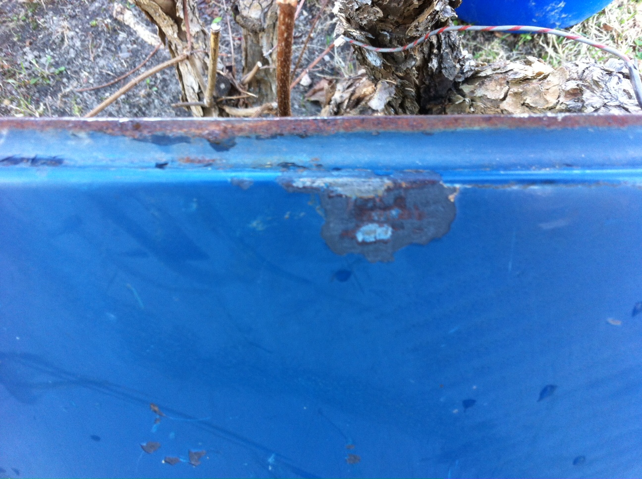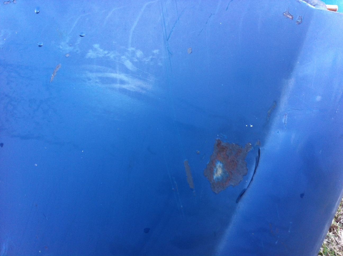 Bara lite ytrost upptill, inga hål. En liten buckla och några skavanker som kanske syns på bilderna. Är rätt skaplig ändå tycker jag. Kan fixa fler bilder.