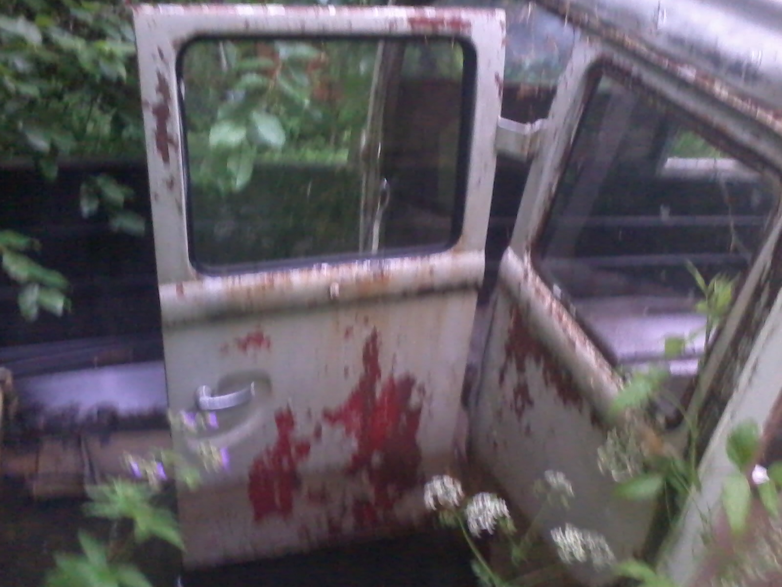 Dörren som saknas på bilen och har tak.