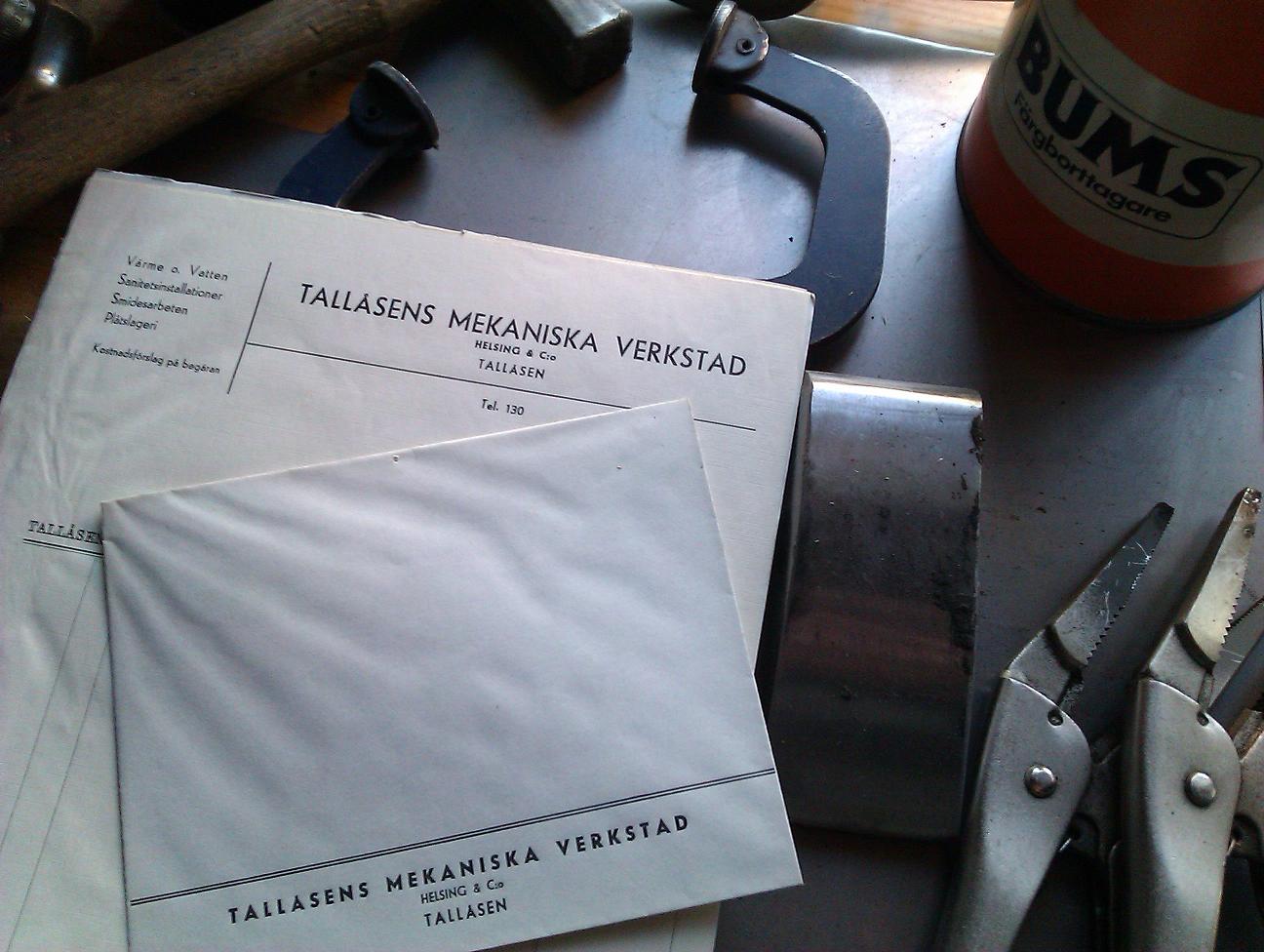 Gården jag och min familj bor på är byggd av min farfarsfar Jacob Helsing och han hade en smedja i den lokalen som nu är mitt garage. På ´50 talet så hade min farfar och hans bröder tagit över och hade då firman Tallåsens Mekaniska i samma lokal med plåtslageri på övervåningen alltjämt kallad Helsings Smedja , eller Smejja i folkmun. OBS! Telnumret.. ICQ/ab  På ´70 talet så byggdes det dock om till garage och så stod det när vi tog över åxå. Senare så har jag naturligtvis isolerat,gipsat dragit in värme och bytt portar.