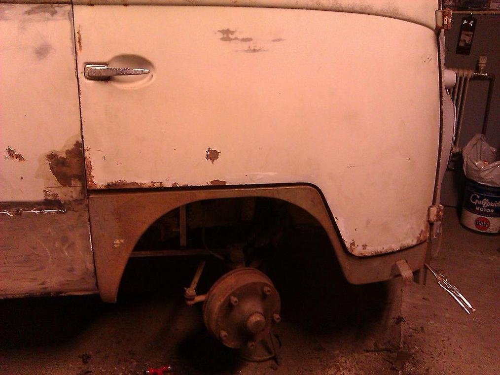 .. måste banka plåt ! Så fram med tumstocken och mäta lite, hyllan från ytterskinnet ska upp drygt 10 mm. Jahapp, hur gör en fattig riddare då då ? Jo borrar ur punktsvetsarna och spänner fast skärmen liggandes på bänken och medelst vinkeljärn och tvingar så pressas det till rätt läge. Sätter en fin liten loppa där och provar på bussen igen och se på fan, det verkar ju funka !