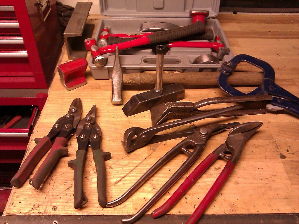 Lägger upp en bild på lite av mina plåtverktyg eftersom det blev en del verktygssnack här åxå för att vissa att man inte måste ha en hel verkstad för att banka lite plåt. Det går med ganska enkla grejer. Lådan med hammare och mothåll är ett Biltema kit som väl får räknas som halvfabrikat.. Jag har fräst nåt mothåll för lite räta vinklar och slipat lite här och där så det passar mej men liksom bra att ha . Knostret som nämndes har jag gjort själv MichaelTH så du måste inte sno kompisens verktyg..