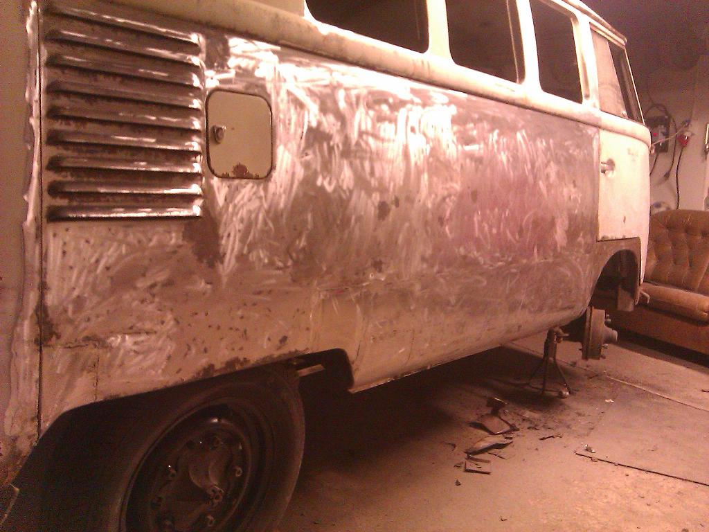 Alldeles framför den biten jag satte längst bak i bakskärmen är det som ett dike ca 100 mm långt, och även ett till mitt under det mittre fönstret ... Ganz seltzam ... måste ju vara gjort på fabrik för att dra ut spänningar eller nåt sånt. Annars så är det just inget spackel alls .
