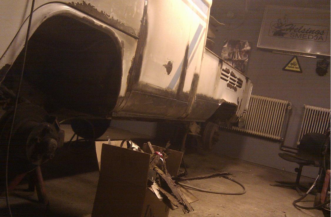 Nåja, det är bara plåt, eller brist på då, men leran i balkar och hålrum har ju iaf hållit formen på grejerna så då finns det ju nåt att malla mot  ICQ/ad men nu är den värsta rosten svetsad så jag håller nu på att spackla upp bakskärmarna och det blir nog grundat en sväng imorrn om det går som jag tänkt mej. Det är en lite rost kvar sen åxå men jag måste hitta på nåt emellan för inte helt tappa sugen... Men det närmar sej !  ICQ/af