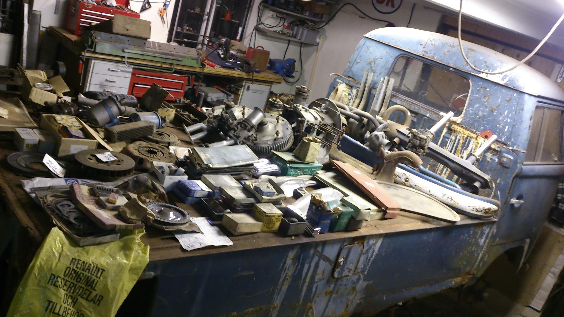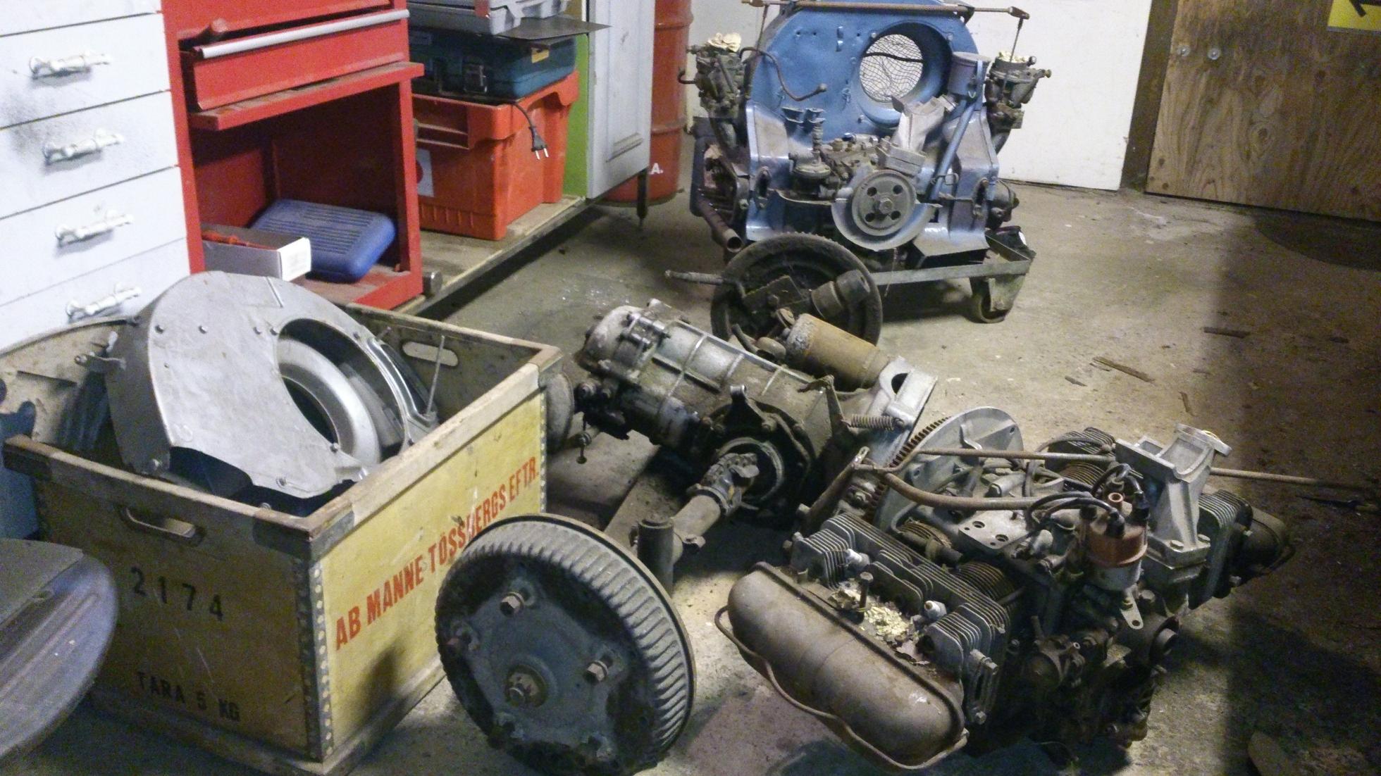 Idag har jag packat upp allt och sorterat en del och googlat massa nummer och bilder så jag tror ganska säkert att det är två i det närmaste kompletta motorer. En ´58 1600 60hp och en ´63 1600 S 75 hp maskin. Växellådan är nog tillhörande 1600S motorn och med tanke på att fästen och svärden är skurna med gas så var det nog en grym slakt av bilen den ursprungligen satt i ... RIP, du gamle krigare.
