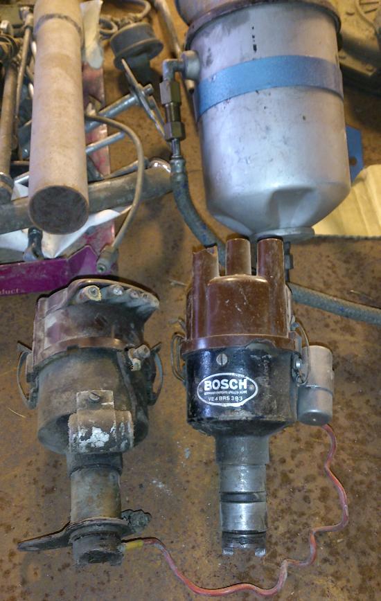 Bengt : Jag kollade på fördelarna idag och den vänstra är " oskruvad" och har inget band så den är nog då en VW 25 hp fördelare. Fin och hel dessutom!