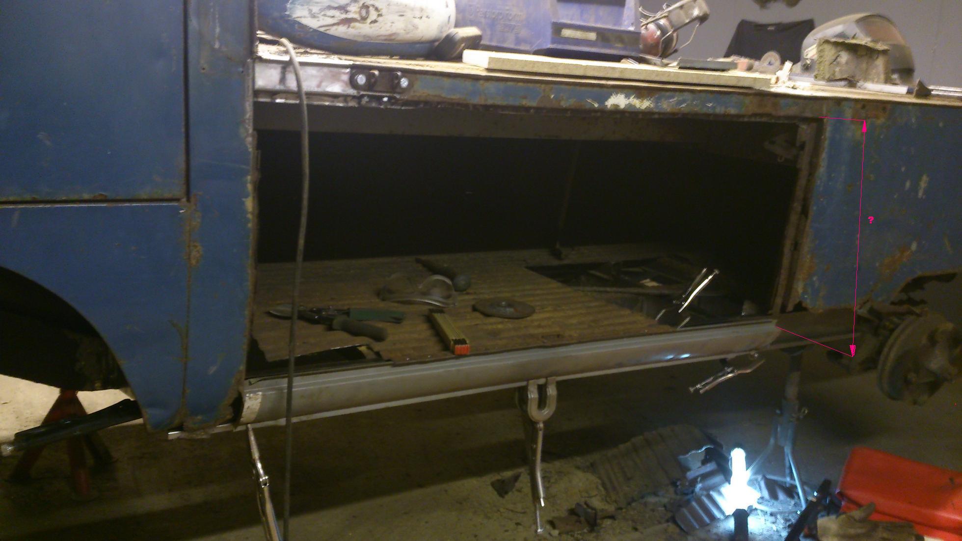 Har kapat bort och måttat in utriggare och tröskeln på vänstersidan, tar lite tid sånt här och nu så behöver jag hjälp med ett mått innan jag startar upp ESAB'en. Allt jag har är så knöligt och kapat sen tidigare så är det nån som en ritning eller kan mäta på sin icke våldtagna pickup. Jag behöver måttet mellan tröskel och övre balk enligt skiss. Troligen så är det 440 mm man det kan vara bra att veta nånting ibland åxå.