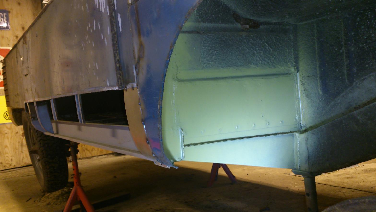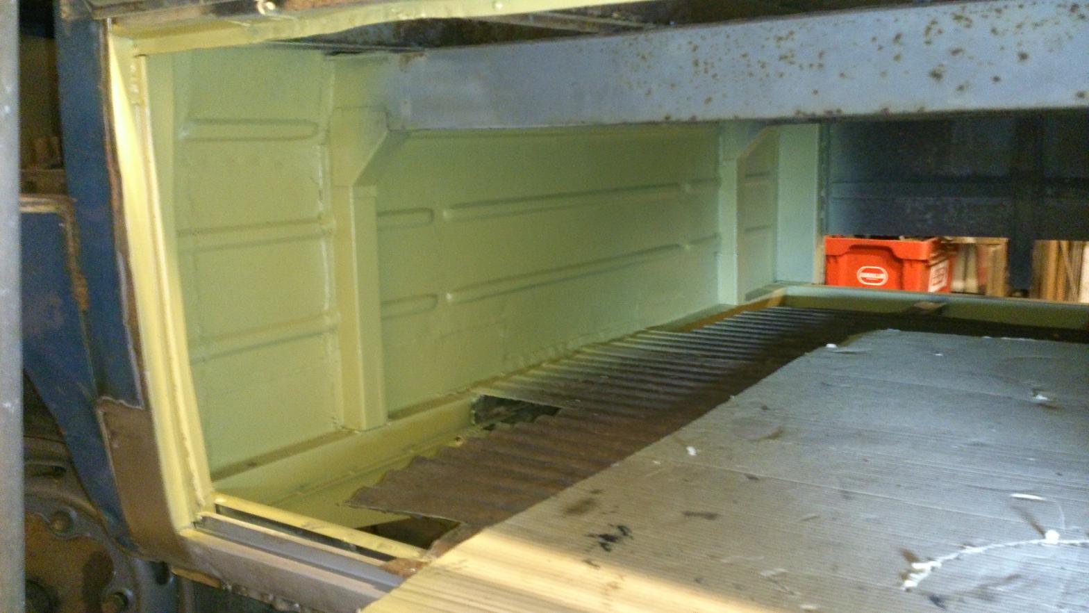 Nu är mellanväggen med hjulhus och trösklar klara, förutom ytterskinnet på höger då och då jag inte hade nån lust att svetsa idag så kändes det rätt bra att få på lite primer iaf. Det känns ju som mera färdigt då med en färg på det hela. Hundra timmar ungefär ligger i pickisen nu enligt loggboken och vi får se hur många till det blir innan jag ( och Danne ) är nöjda. Tröskelskinnet och insteget vänster fram ska dit iaf sen får vi se.. jag har lite eget skrot att sätta fart på åxå.  ICQ/af