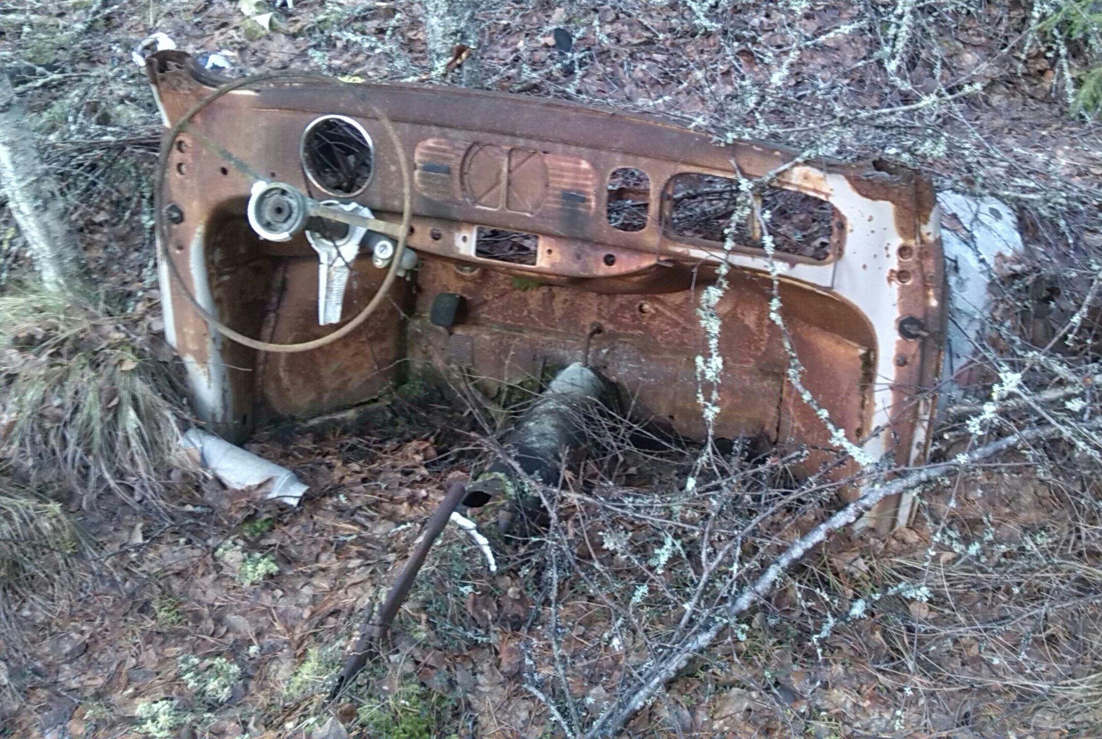 Den här hittade jag efter ett tips från en i byn,den var väldigt fin under men sätena var borta och istället fans en träbrits för att övernatta på  vid älgjakten. det satt nyare plåtar på den. Så jag tog regnr och hittade ägaren som var en kvinna som hade sålt den för 20 år sen och dom hade skrivit ägarbyte men köparen postade aldrig ägarbytet, så kvinnan har betalat registerhållningsavgift sen dess. Men nu är bussen skriven på mig och jag har lov av markägaren att hämta den ICQ/ab http://i1004.photobucket.com/albums/af162/falmarksheden/IMAG0272_zps06f1251e.jpg