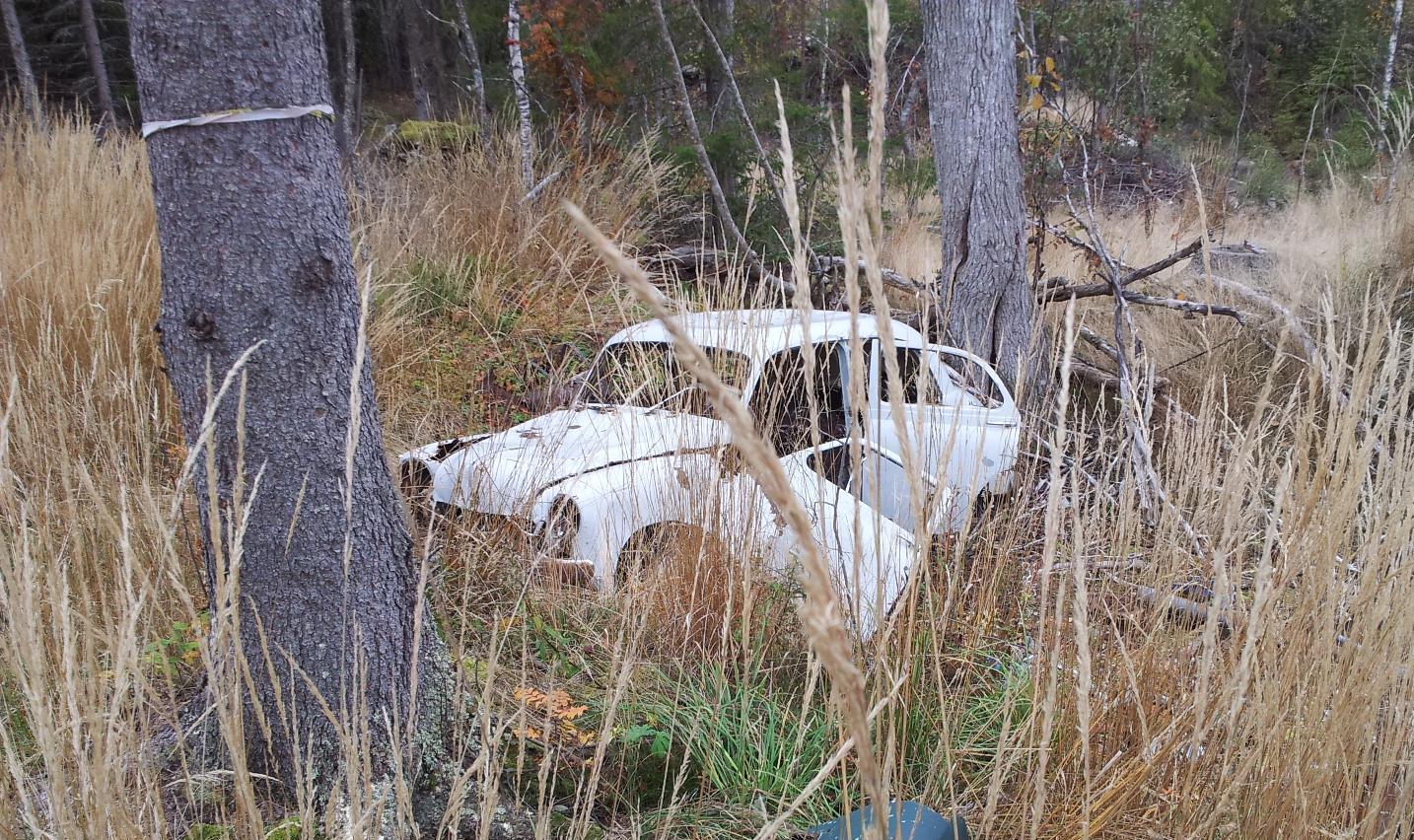 Hur som helst, efter att ha machetat mig fram så hittades den till sist. Vet ej om det var en kombination av dåligt minne, eller att åren gått fort och blivit många sedan jag tittade till den, men den var inte riktigt så bra som jag kom ihåg. Det känns som ett hopplöst objekt. Att taket är intryckt hade hade jag inget minne av, och det finns inte mycket som skulle kunna plockas på den heller. Möjligen bakstötfångaren för den satt märkligt nog kvar och såg inte så krokig heller. Jaja, det får bli nästa sommars uppdrag i sådana fall.