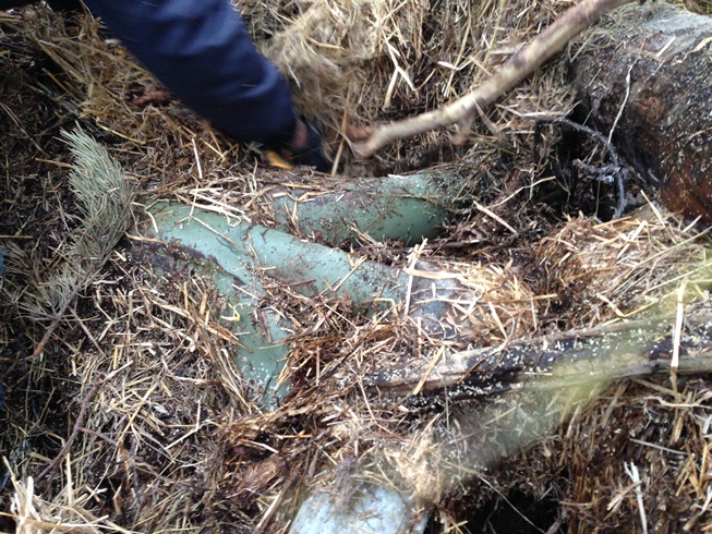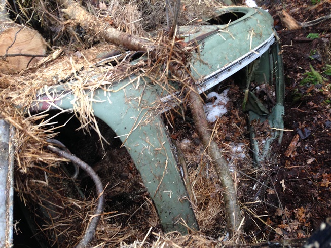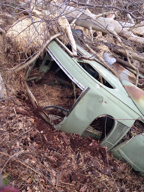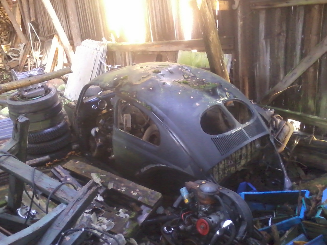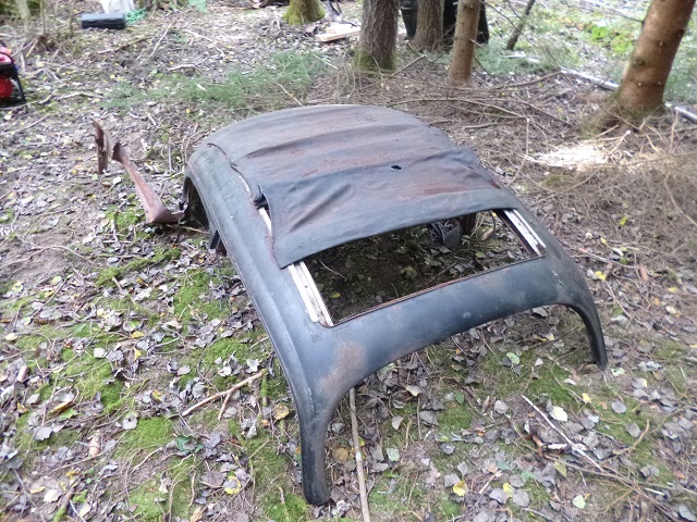 Jag fick tips om den i våras. När det var dags att försöka få loss den hade bonden dumpat 40 balar ner på skrotgropen. Som tur var stack bubblan fram så det gick att gräva fram den. Så med elverk, tigersåg och motorsåg befriades taket från karossen. Det som låg ner i marken var för övrigt bara fragment kvar av. Ramen sparas till framtida projekt.