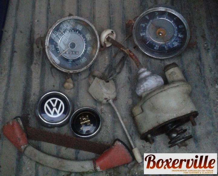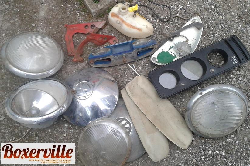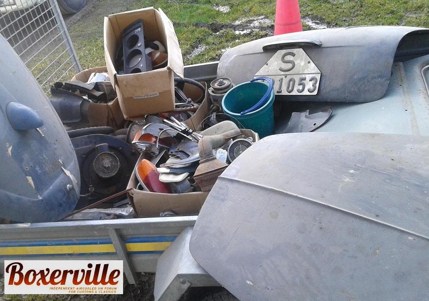 . Blandat bubbla 50-60 tal, ghia sent 50 och till split och bay buss. Bland de stora delarna fans det tex. Typ1 -59 hö dörr med allt utom dörrsida i fint skick + en baklucka från en -60, Nos split-buss ljuddämpare 59-62 + Nos bak kofångare split-buss 55-67, Huv och baklucka från en Ghia -57 el -58, rutor och chromlister. Reservdels katalog, instruktionsböcker, fäljar, bak och fram lampor mm.