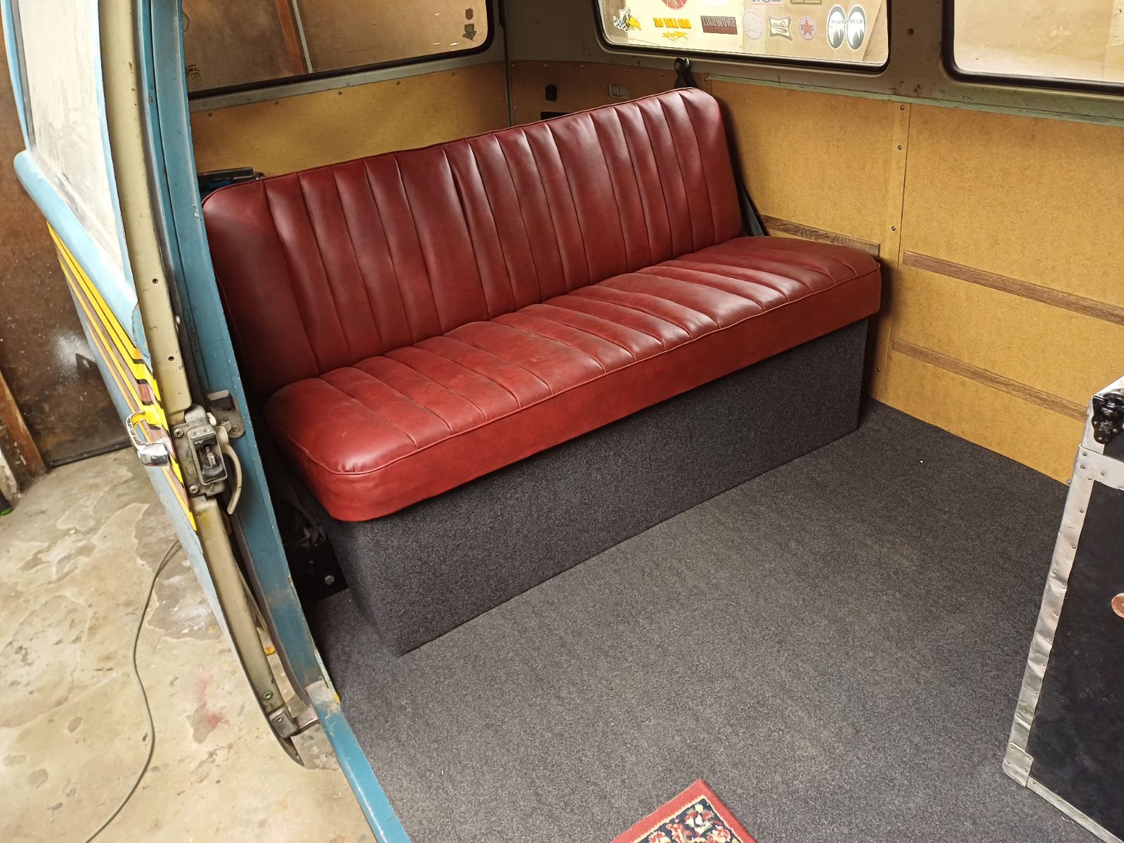 Det som jag har lagt tid på i stället för att åka runt är att göra klart inredningen. Min plan har hela tiden varit att göra en så enkel inredning som möjligt men med ett bra uttryck som stämmer med bussen. Jag byggde mig en rockenroll soffa. Jag hade inhandlat begnagnad fällmekanik som jag behövde bygga en stomme till och göra en soffa med sitts och ryggstöd. Jag ville att soffan skulle få samma uttryck som framstolarna och så skulle det finnas säkerhetbälte för tre personer. Efter lite fabricerande stog allt klart och jag känner mig nöjd. Här kommer lite bilder.