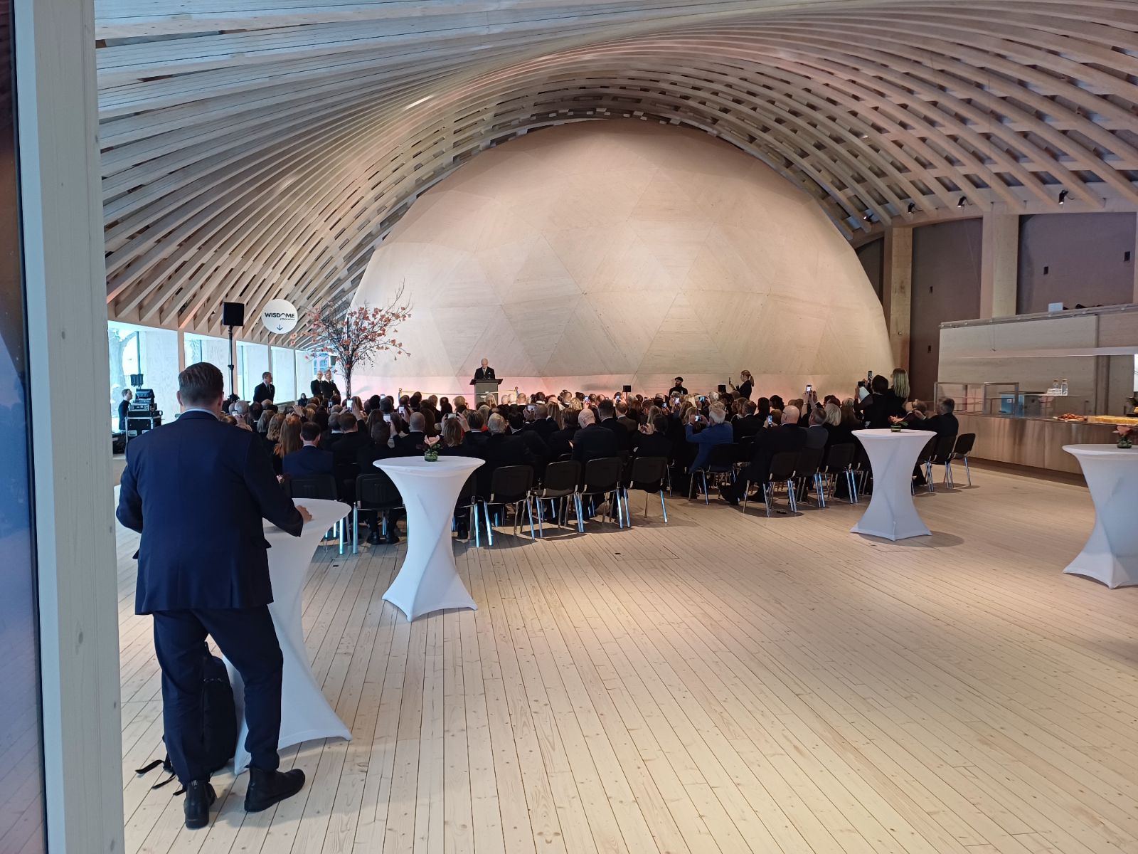 Just, tänkte att det är många här på forumet som är intresserade av form, arkitektur och konstruktion. På mitt jobb, tekniska museet har vi byggt en hall helt i trä med en självbärande tak konstruktion. Det innbär att på dessa ca 900 kvm finns det inga bärande stolpar. Hela taket bärs upp av balkar som är cnc frästa i Schweiz, och hålls samman av en genialt utformad fackverkkonstruktion och dymlingar med 0 mm i feldifferens. Klotet som bor i byggnaden är en dom för 365 graders 3-D visualiseringar. Klotet heter Wisdom. Wisdom projektet finns i några andra städer i Sverige, Norrköping, Göteborg, Malmö och Umeå.  Bilden är från vår invigning. Och den skarpögda ser naturligtvis att det är vår kung som sår där framme.  ICQ/bs