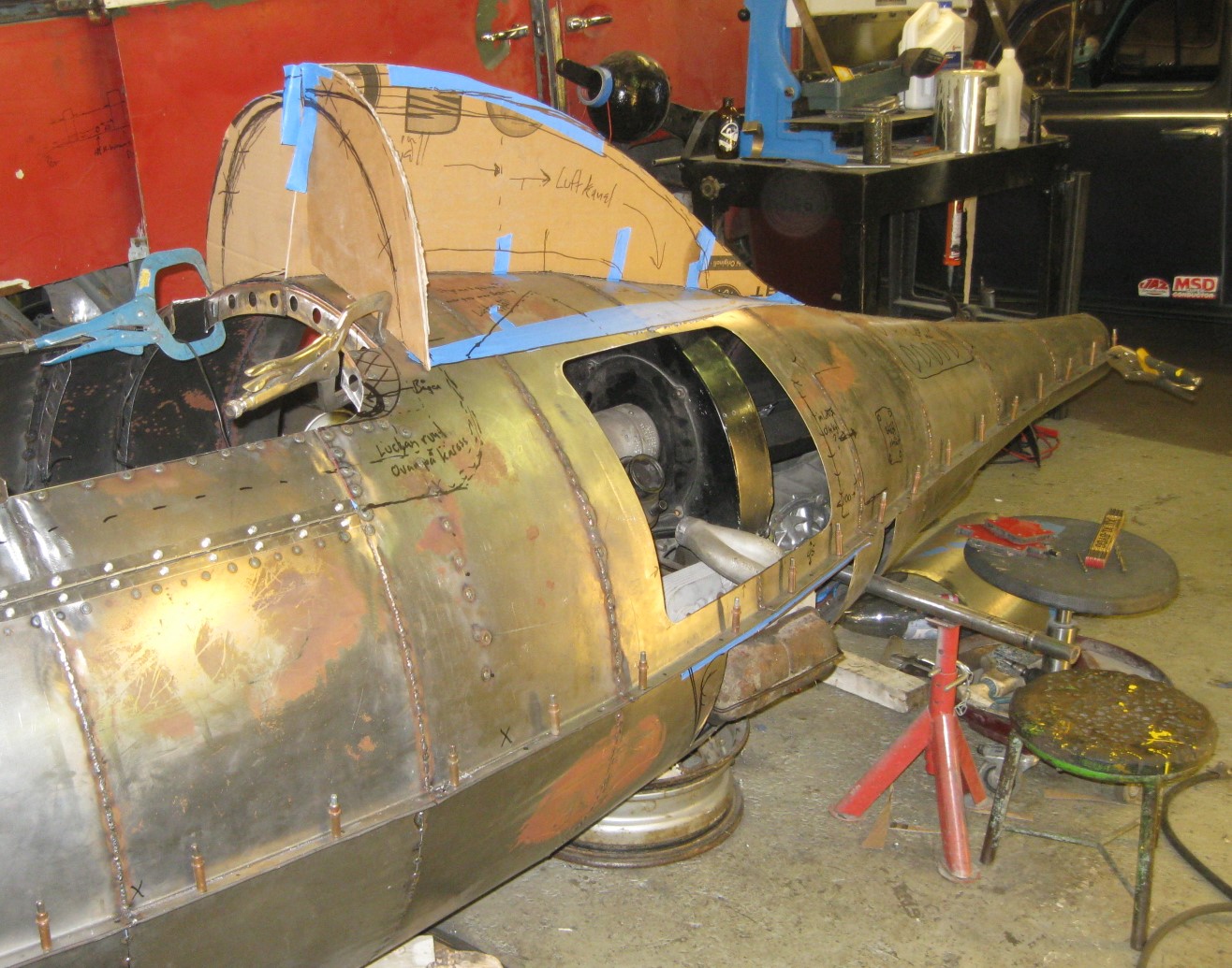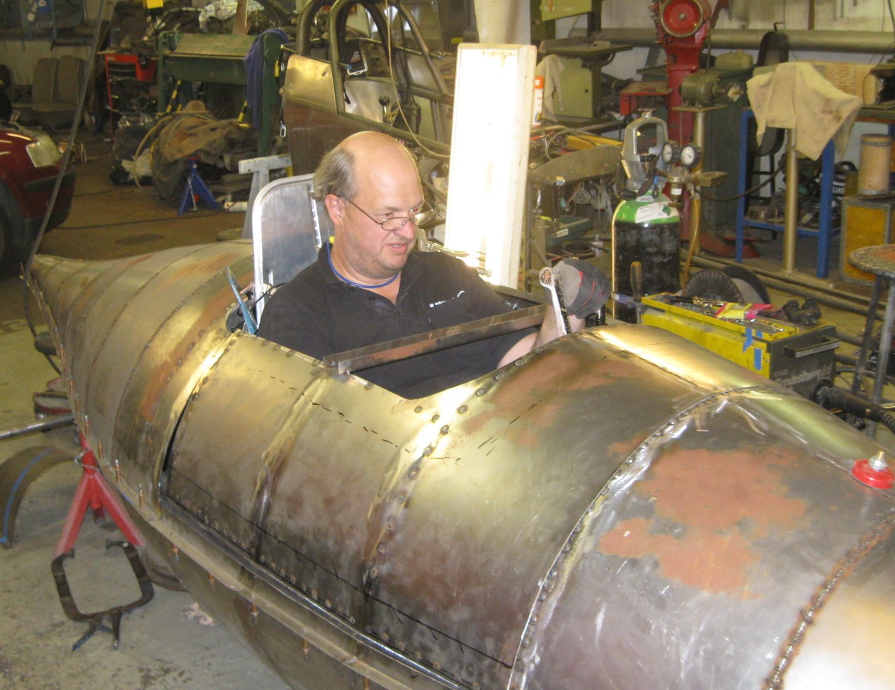 har nu börjat kapa lite i  karossen så man kan sitta i den, det får sen bli en lucka att fälla upp åt sidan så man kliver in från höger sidan, stolen blir ungefär i denna höjd ,nästa steg blir inre förstärkningar i karossen o sedan kapa upp luckan