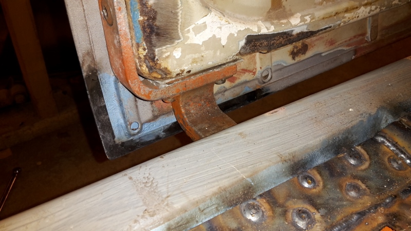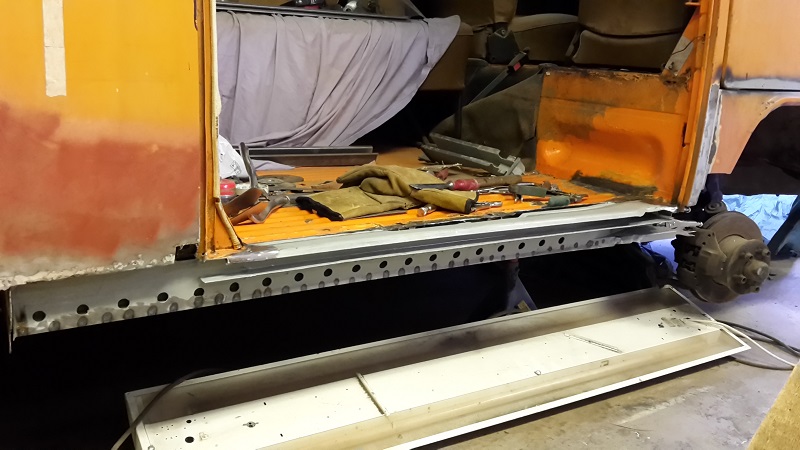 Mera tröskelbilder? Ok, här kommer en. Jag har äntligen fått tummen ur och svetsat dit mellantröskeln/skenan till skjutdörren. Skönt, för nu kan inte dörrhålet slå sig så mycket längre. Notera att jag fick en släng av OCD och borrade ventilationshål (?) precis som orginalet hade. Kommer aldrig att synas, men kändes rätt ändå.... Alla plåtar är målade två gånger med epoxyproimer innan jag svetsade dit dem. För sen går det ju inte. Ytorna där plåt ligger mot plåt (underkanten som punktsvetsades) målades bara med Volvo's svetsprimer. Epoxyprimer som utsätts för svetsen luktar APA!!!!